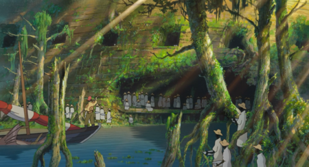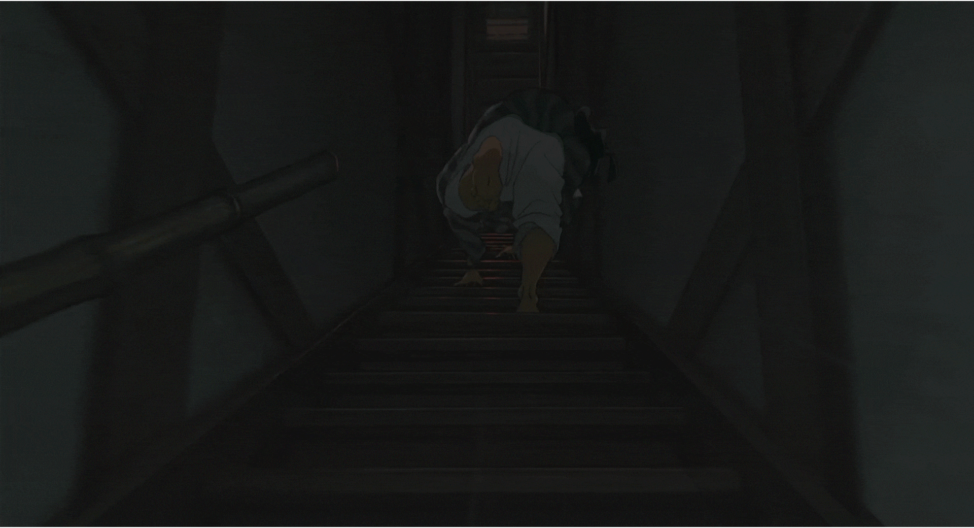 В части переезда и знакомства с новым домом сцены тихие и особенно длинные, что подчеркивает отчужденность Махито. Нет детальных шотов на убранство поместья или на что обратил бы внимание герой, так как ему это безразлично. Из-за их отсутствия создается впечатление объективно рассказанной истории.