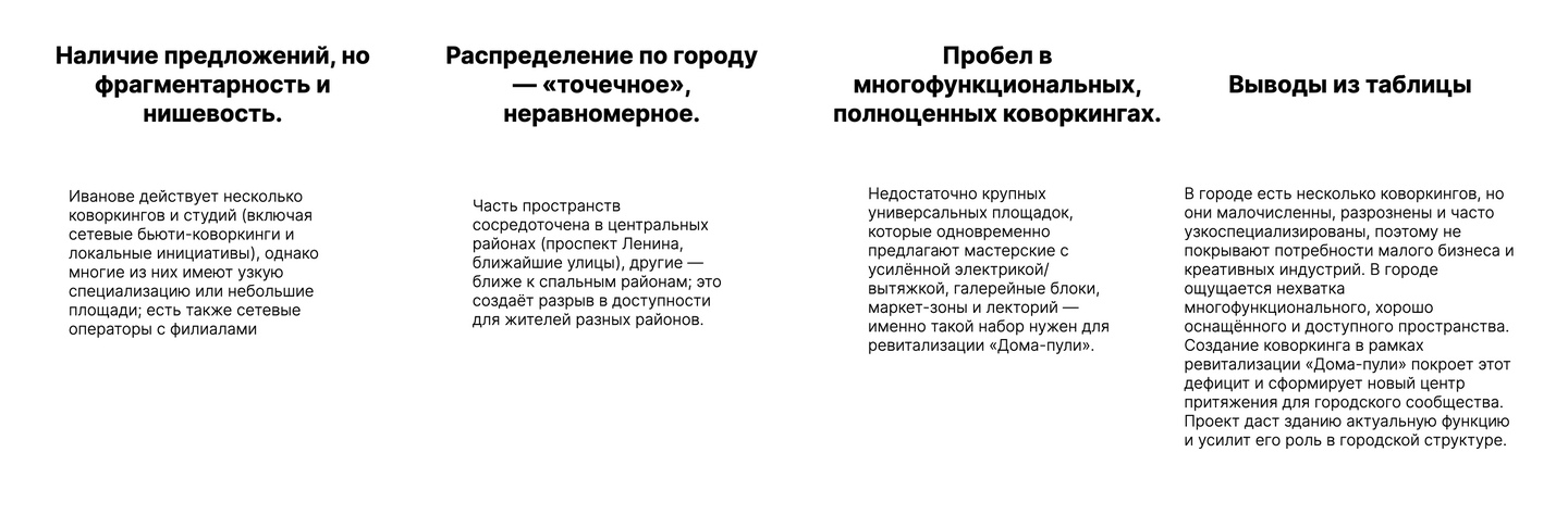 Таким образом, в городе невест нет хорошо развитой сети универсальных коворкингов с гибкими условиями, мастерскими, выставочными залами, местами для мероприятий, галереями или маркет-пространствами, которые могли бы стать точками притяжения для малого бизнеса, креативных индустрий и стартапов. Именно поэтому представляется актуальным создание нового, многофункционального пространства — такого, которое объединит рабочие места, офисы, мастерские и общественные зоны, чтобы закрыть существующие пробелы, а также стимулировать развитие предпринимательства и культурных инициатив.