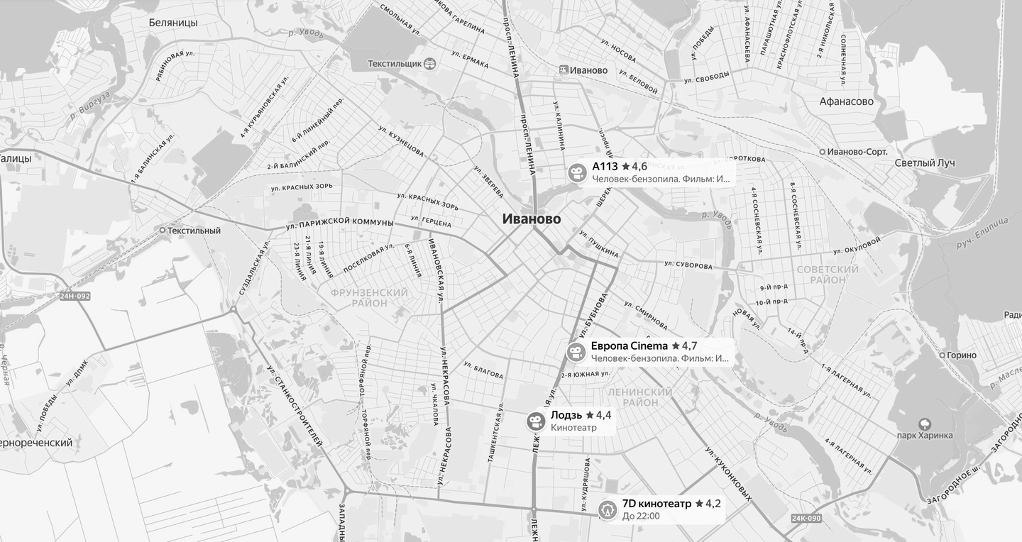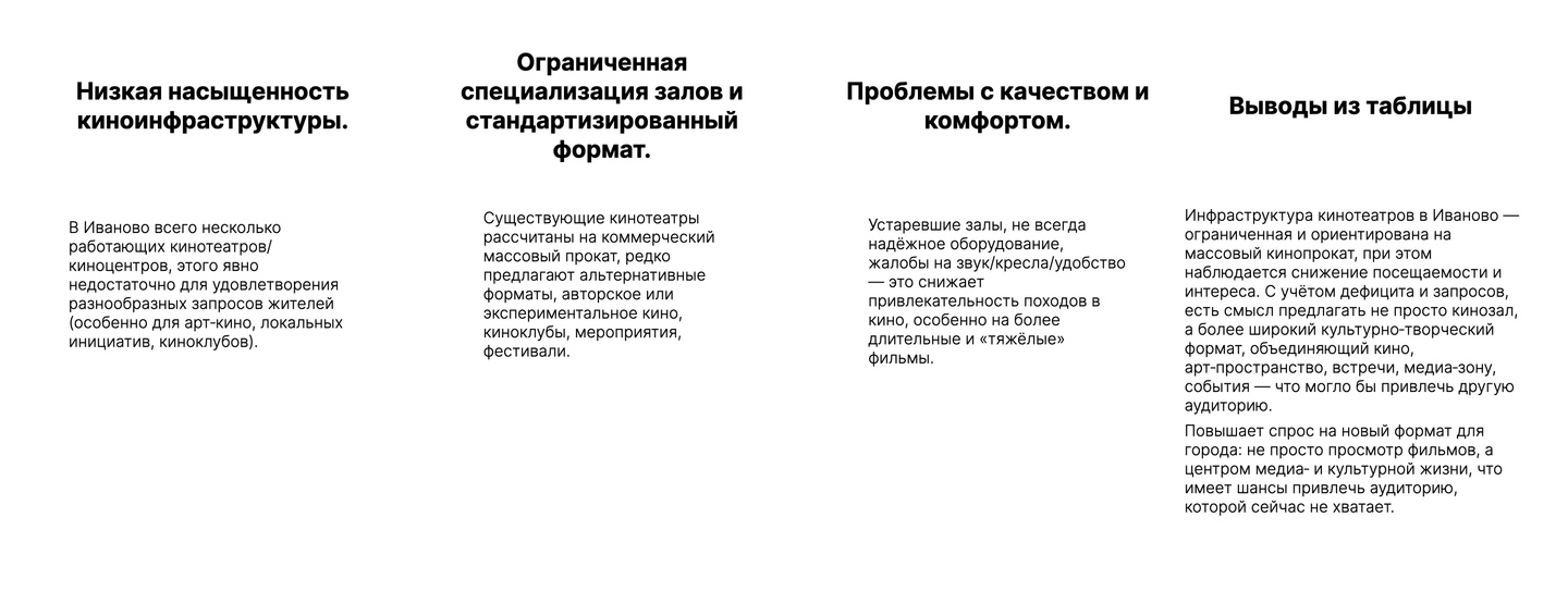 В Иванове действует несколько кинотеатров и кинозалов, ориентированных в основном на массовый прокат фильмов. Их количество ограничено, распределение по городу фрагментарное, а инфраструктура не всегда соответствует современным стандартам комфорта и мультимедийного оснащения. В таких условиях актуальной выглядит идея создания многофункционального кинозала в составе проекта ревитализации «Дома-пули», который мог бы сочетать просмотр фильмов, медиа‑активности и культурные мероприятия, закрывая существующий дефицит городских киноформатов.