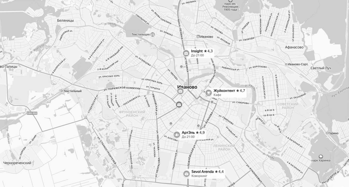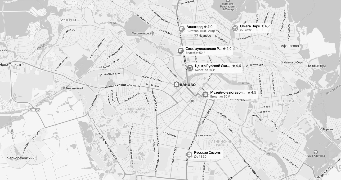 Большинство авангардных построев Иванова сосредоточены на проспекте Ленина и ответвляющихся от него улицах, тем самым маркируя историко-культурное своеобразие центра города. Важно отметить, что помимо чистых конструктивистских форм, на карте также представлены здания, отражающие стилистику постконструктивизма, раннего советского модернизма или имеющие черты переходных стилей, что подчеркивает сложность и многообразие архитектурного ландшафта того времени.