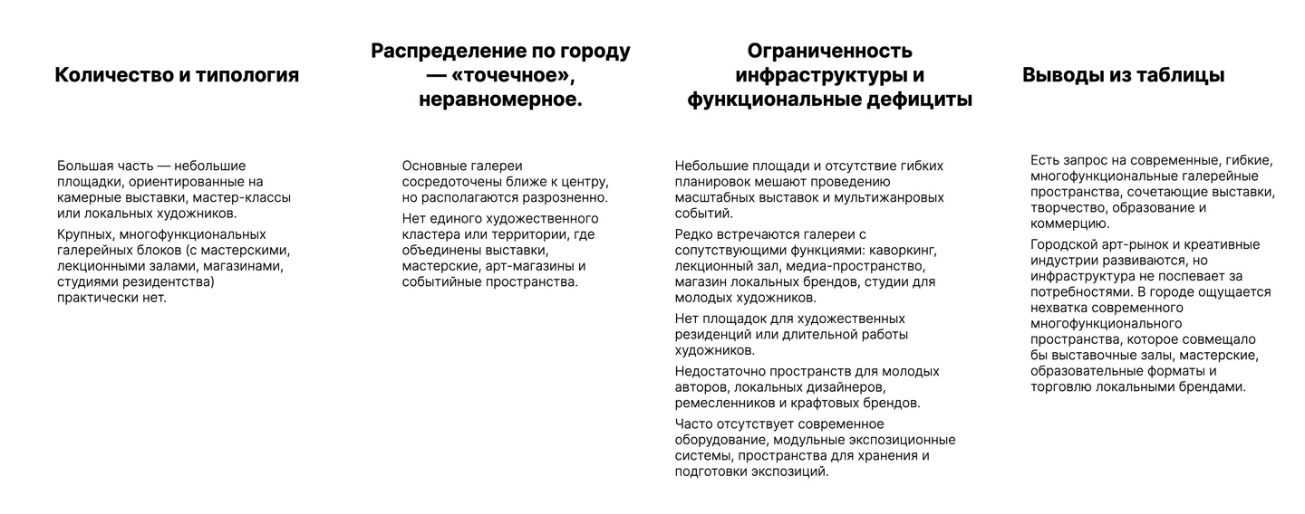 В Иванове существует несколько галерей и арт‑пространств, включая государственные музеи и независимые площадки для выставок и мастер-классов. Однако их количество невелико, площади ограничены, а функционал чаще ориентирован на локальные и камерные форматы. В городе ощущается дефицит многофункциональных галерейных блоков, которые могли бы объединять выставочные залы, мастерские, образовательные и коммерческие зоны. Создание подобного пространства в рамках проекта «Дома-пули» позволит закрыть этот пробел и сформировать центр притяжения для креативных индустрий и культурной жизни города.