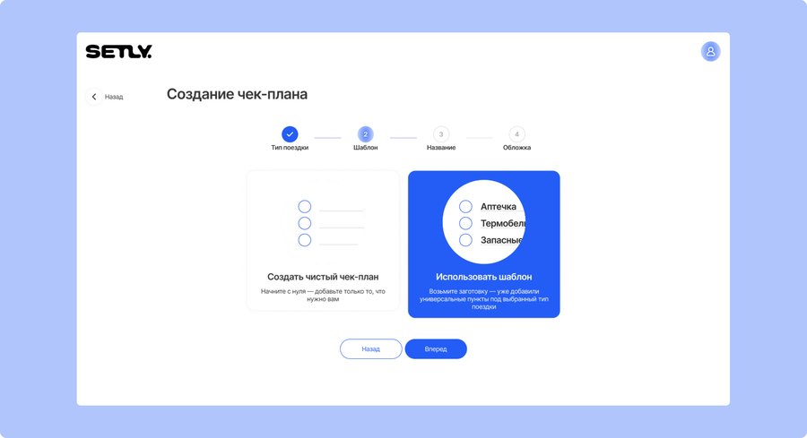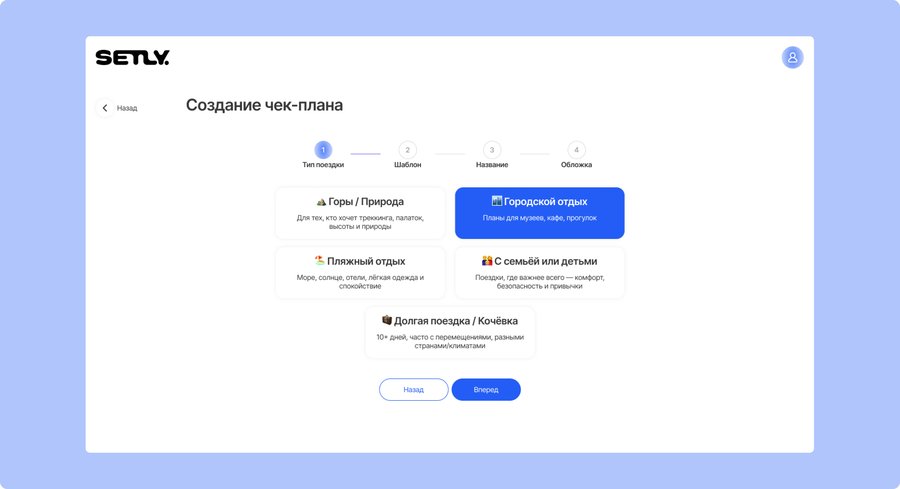 Setly — это медиа‑платформа для планирования чек‑планов для путешествий, состоящая из разделов «Главная», «Чек‑планы», «Статьи», «Тесты», а также «Редактор персональных планов», «Личный кабинет» и страниц «Вход/Регистрация». Главный концепт платформы — простой и понятный интерфейс, с которым может работать широкая аудитория без дополнительного порога входа.