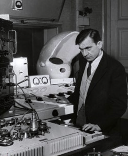 Слева: Неизвестный фотограф, Пьер Шеффер, 1960-е гг.; справа: Laszlo Ruszka / INA via Getty Images, Сцена акусмониума для концерта GRM, 1980 г.