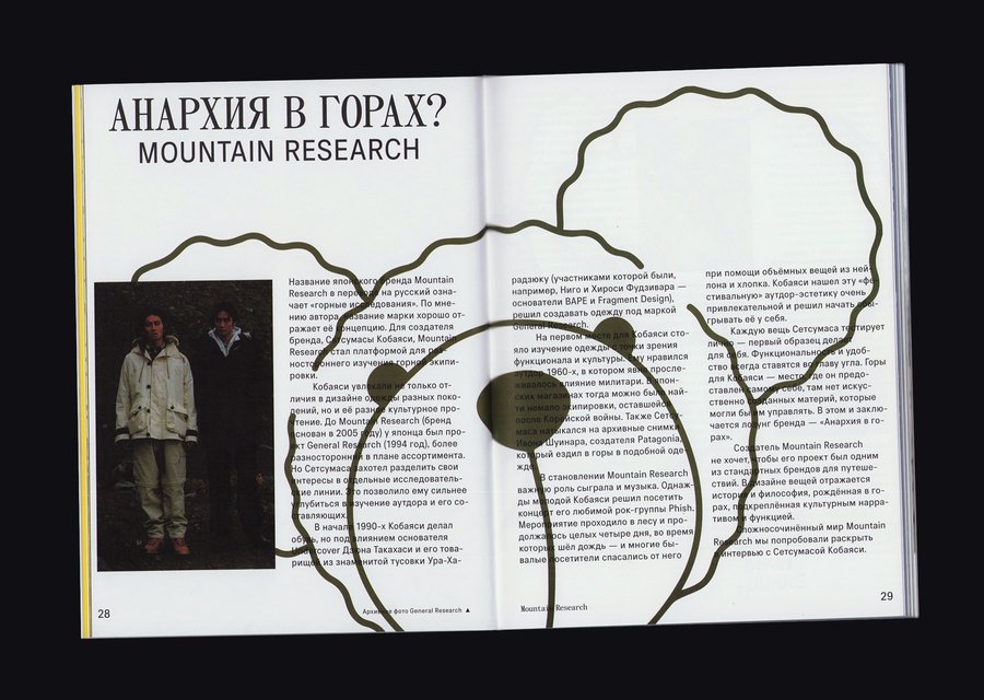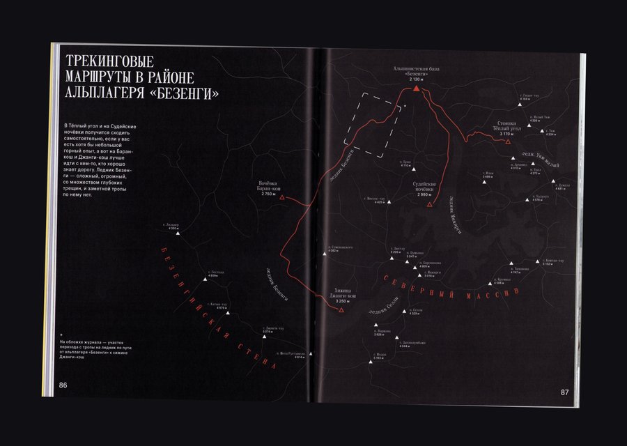 Контент поделен на два блока, которые напечатаны на разной бумаге. В первом — интервью и статьи, во втором — фото нетуристических маршрутов и троп.