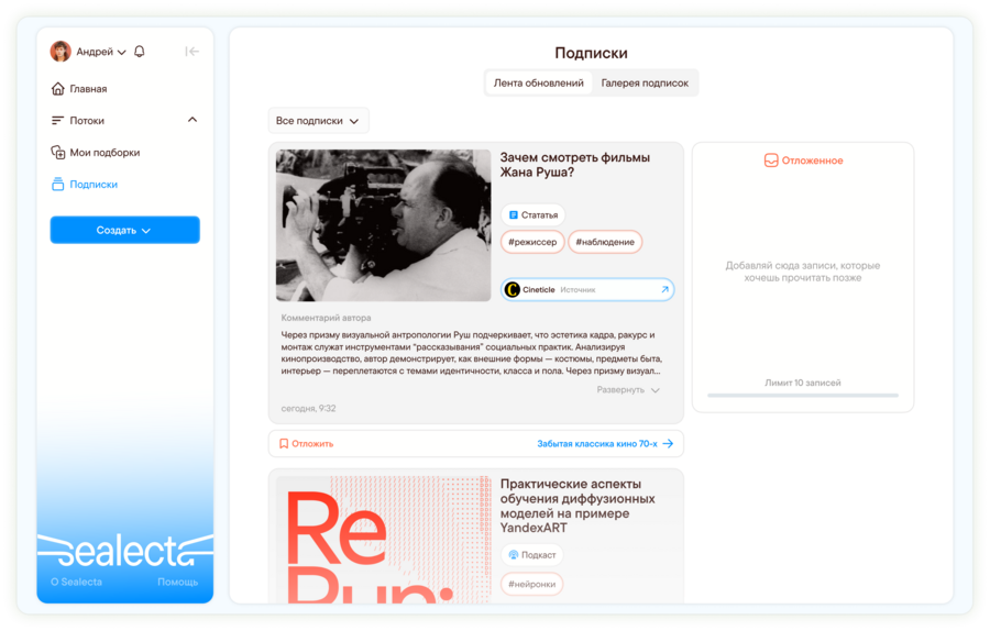 Интерфейс Sealecta организован как последовательность шагов работы с подборками: от сбора источников до просмотра лент обновлений и управления монетизацией. Каждый раздел решает отдельную задачу.