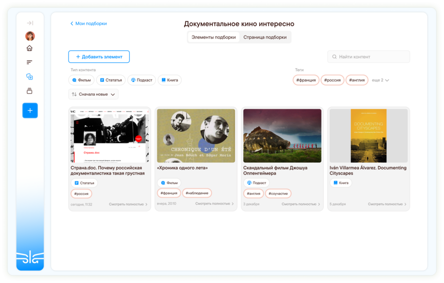 Раздел предназначен для удобного редактирования подборок автора: здесь можно оформить страницу подборки, редактировать и просматривать ее элементы. У каждой подборки есть категория, статус обновляемости и видимости (черновик, в архиве, приватная, публичная). Все подборки сортируются по дате обновления, создания и по алфавиту. Вверху фильтруются по типу доступа (бесплатная, по подписке, по единоразовой оплате, по ссылке). Дополнительно подборки с публичным доступом сортируются по популярности. Внутри каждой подборки есть дополнительные фильтры по типу контента и тегам.