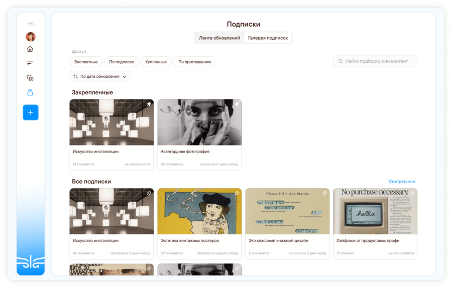 Режимы ленты и галереи также поддерживаются при просмотре отдельной подборки. В этом случае режим галереи отображает карточки элементов, а не самих подборок. Страница подборки у автора состоит из обложки, названия, описания, типов контента в подборке (определяются автоматически и могут исправляться автором), тегов (которые автор создает сам), категории подборки и блока с информацией о доступе и подписчиках. У читателя эта же страница выглядит чуть проще: вместо настроек доступа — блок с условиями и кнопкой оформления платежа. При этом пользователь может увидеть часть материалов из платной подборки в режимах ленты и галереи, чтобы понять её ценность до момента покупки.