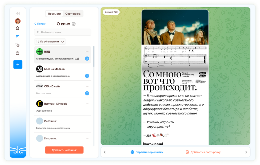 Job story. «Когда я в течение дня просматриваю несколько сайтов, Telegram‑каналов и рассылок, я хочу видеть эти источники в одном месте, чтобы не держать в голове, где и что я сохранил или видел».