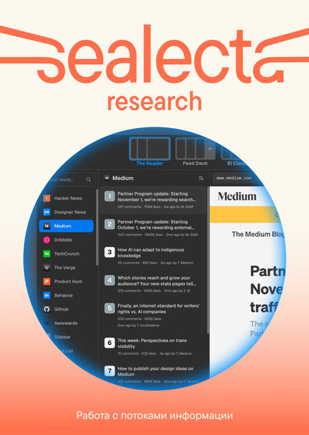 Muzli — расширение, которое также заменяет новую вкладку, но делает акцент на визуальной ленте для дизайнеров. В основе интерфейса плитка из обложек проектов, собранных из сотен профильных источников (Dribbble, Awwwards, Designspiration и др.). Пользователь может настраивать список источников (более 160 вариантов) и перемещаться между разделами в нижнем меню. Карточки текстовых источников и проектов выглядят почти одинаково — у них нет системы превью и режима чтения. Отдельно у Muzli есть среда для авторов, где можно публиковать свои проекты, часто с большим количеством визуальных материалов. Также редакция сервиса регулярно создает свои подборки Muzli Picks для дизайнерского вдохновения, превращая платформу в медиа.