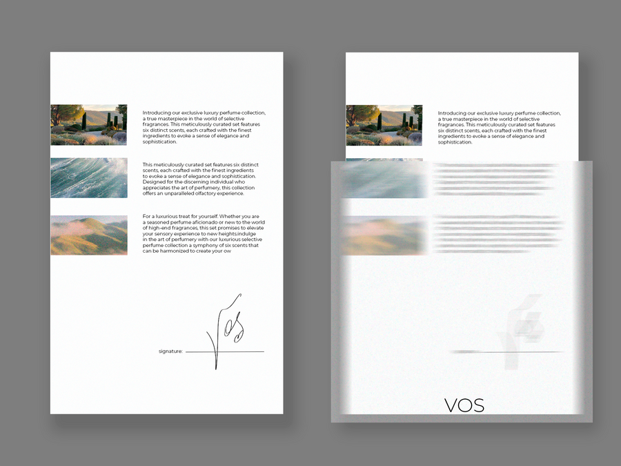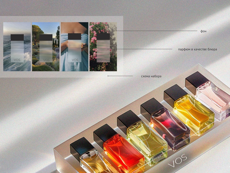 VOS — селективный парфюмерный набор, состоящий из 6 ароматов, которые можно сочетать в любой комбинации, отталкиваясь от вкуса и настроения, что позволяет каждому обрести свой уникальный аромат, отражающий его внутреннее «Я».