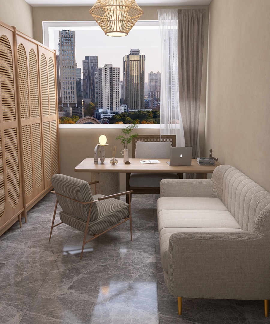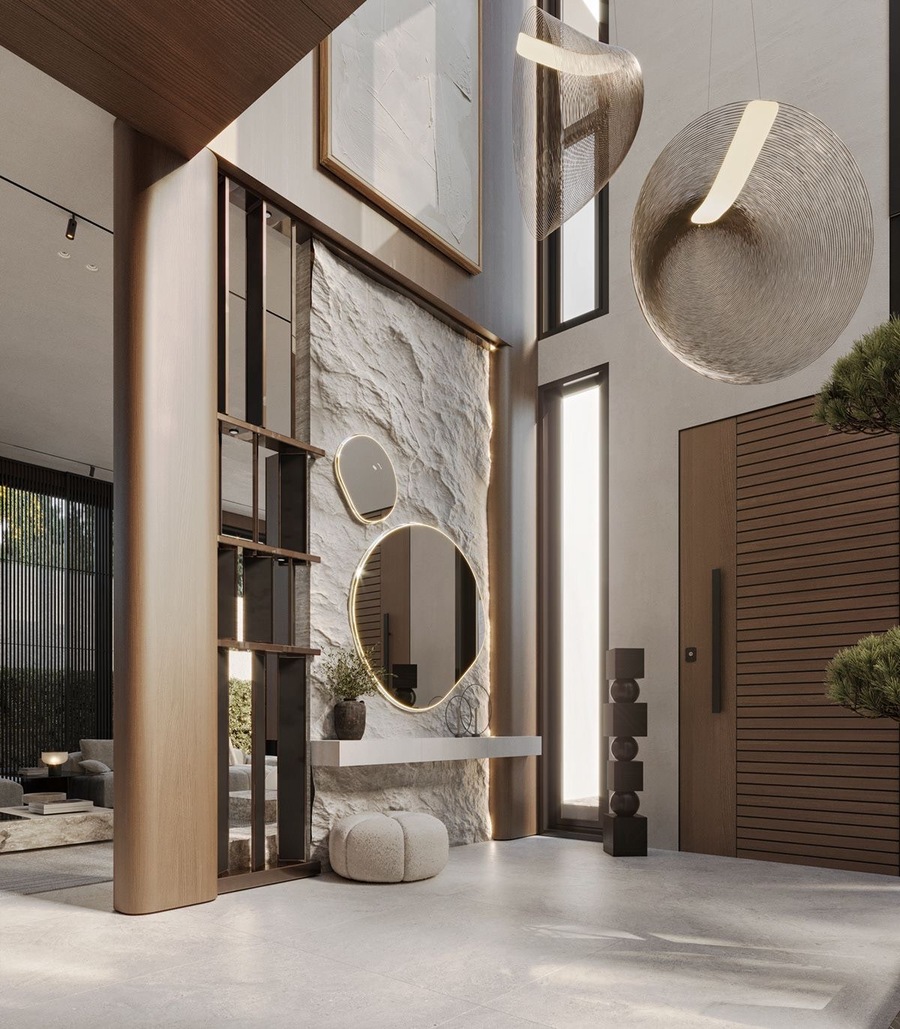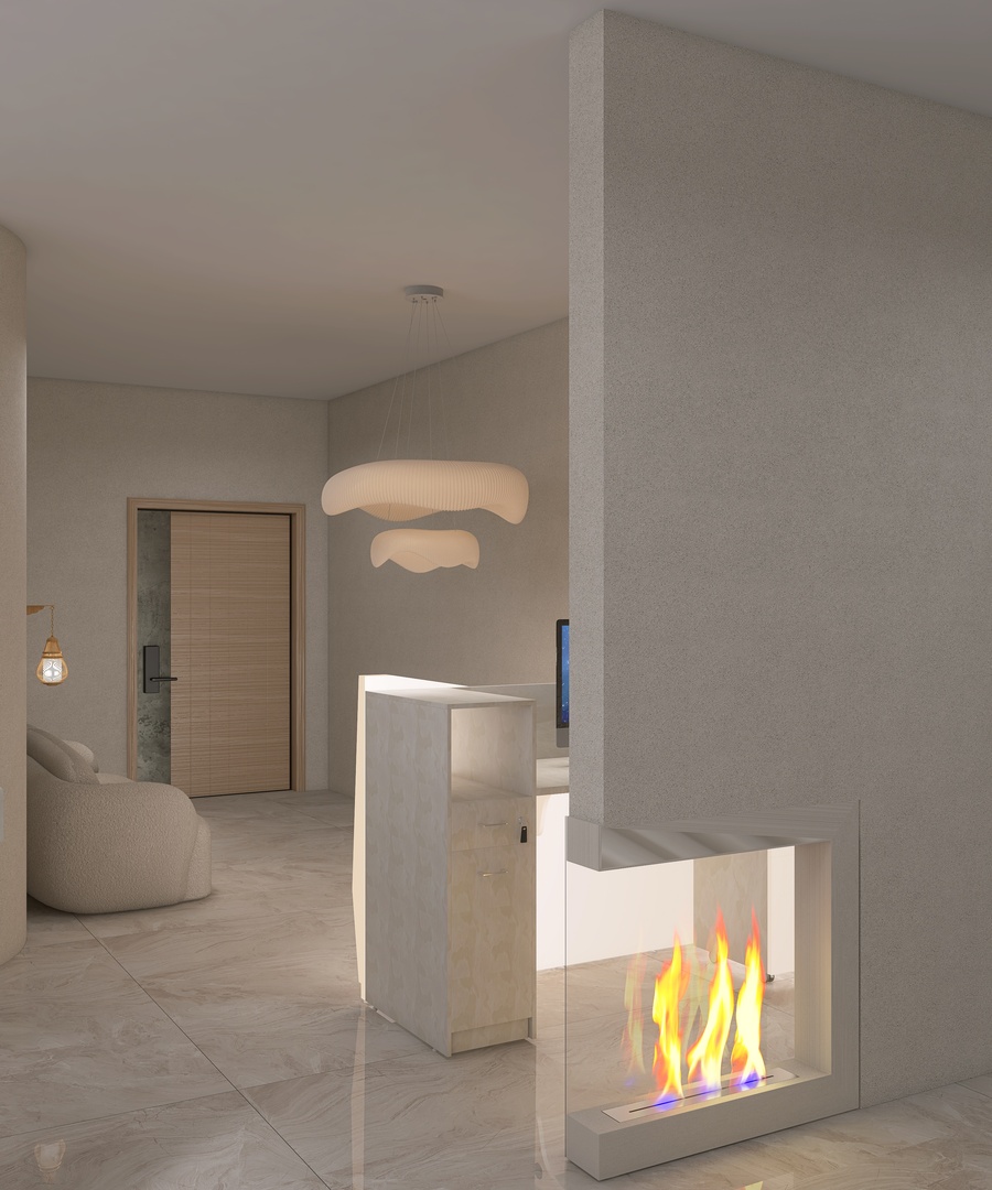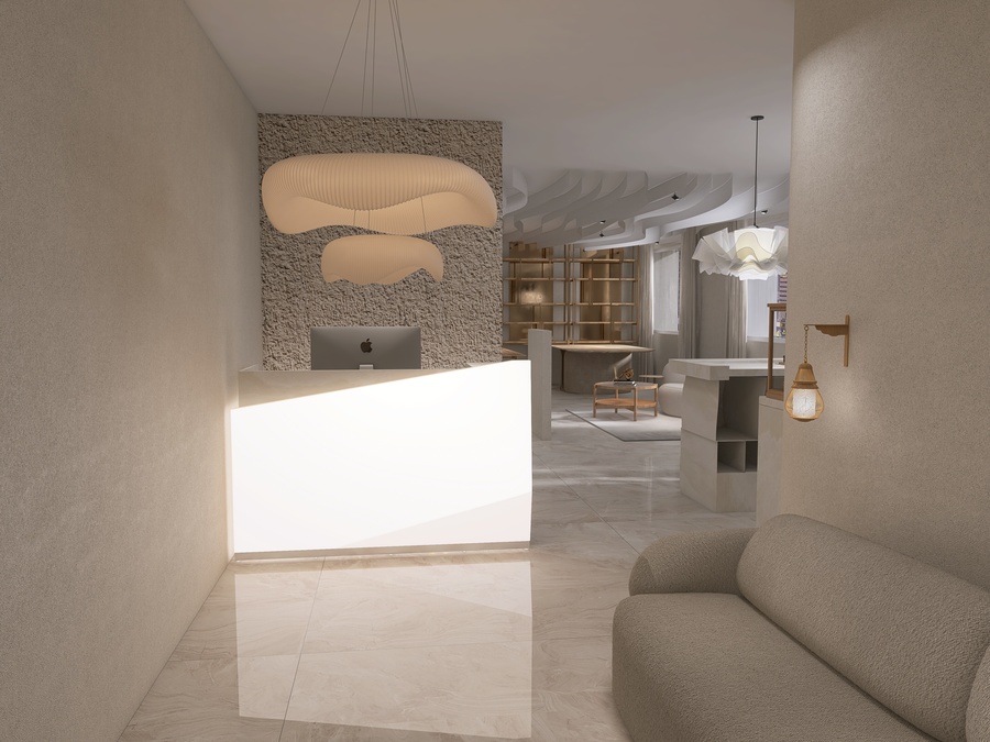 Использование текстуры на полу и стойке ресепшена, напоминающей натуральный камень, песок или волнистые линии на стенах. Тонкие плитки травертина, известняка. Это создает ощущение органичности и привязки к природной среде.