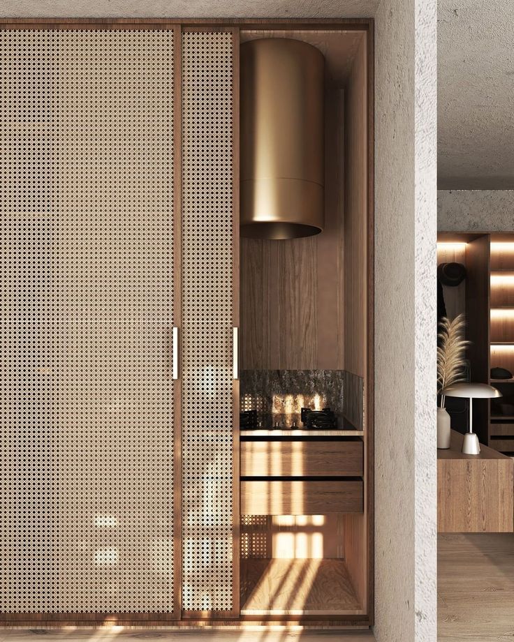 Ротанговый шкаф, журнальный столик из латуни и парящая люстра «эффект ветра».