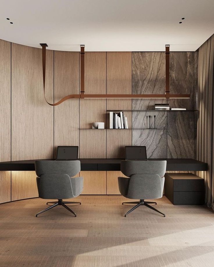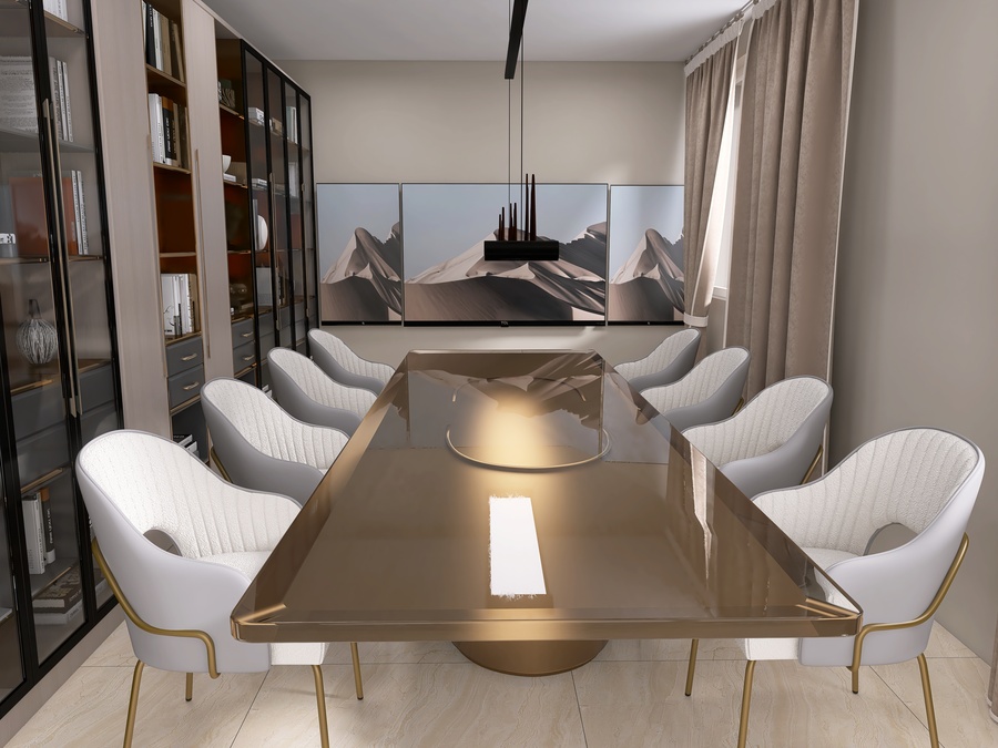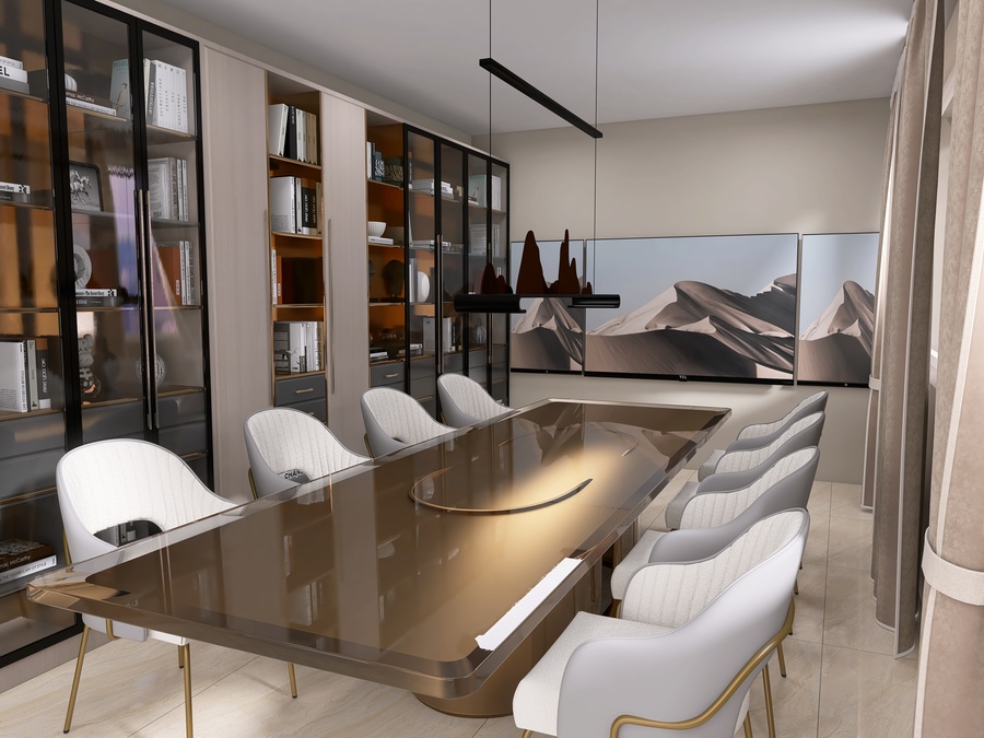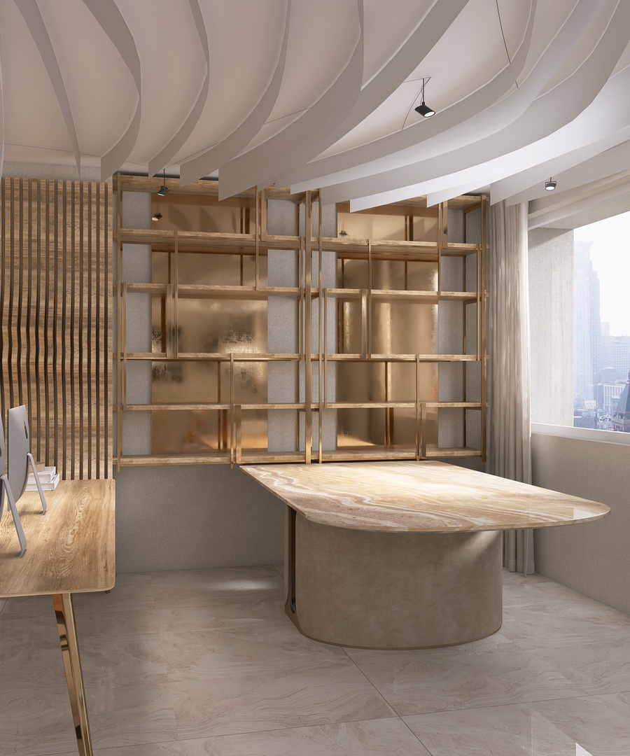 Стеллаж с добавлением латуневых вставок. Интерактивные экраны из концепции для добавления технологичности, инновационности и удобства. Удобные стулья из материала — букле. Люстра — волна.