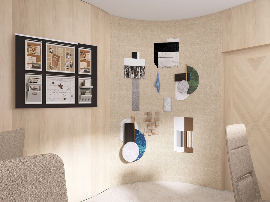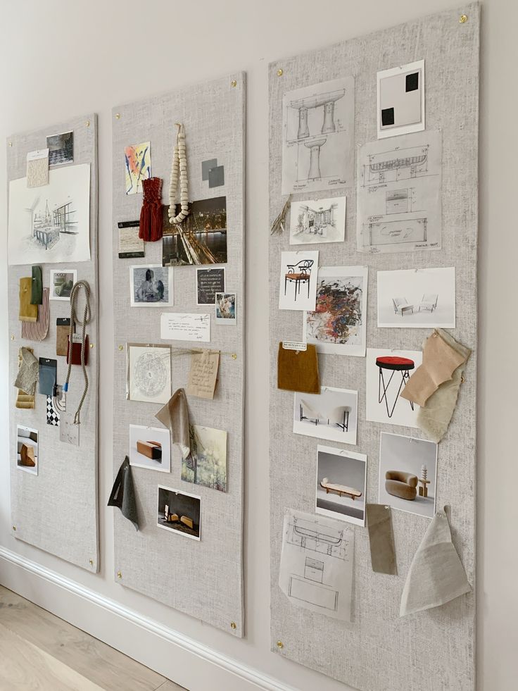 Доска на всю стену для подбора материалов — также еще одно функциональное решение для офиса дизайн-студии. Декоративная штукатурка в отделке стен, травертин на полу.