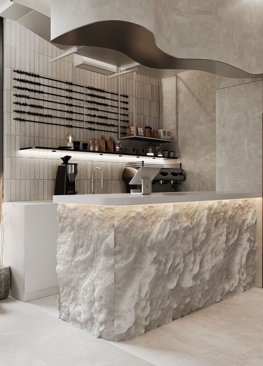 Рассеянное, скрытое освещение придает формы и текстуры, добавляет освещение и драматичность пространства. Известняк в отделке бара. Мягкие формы в светильниках.
