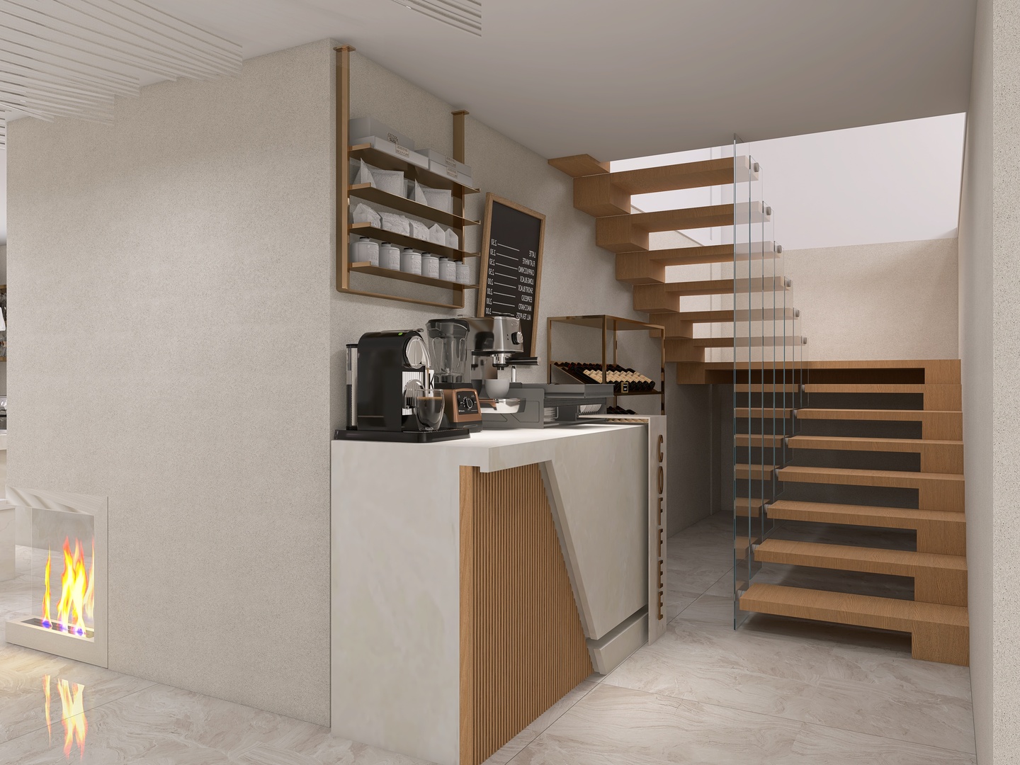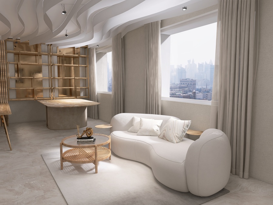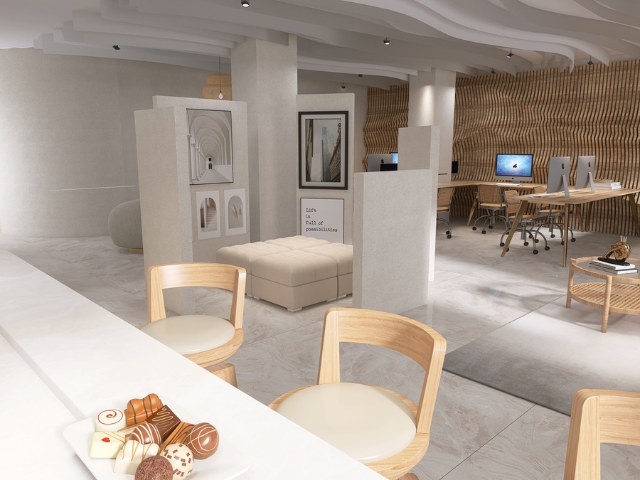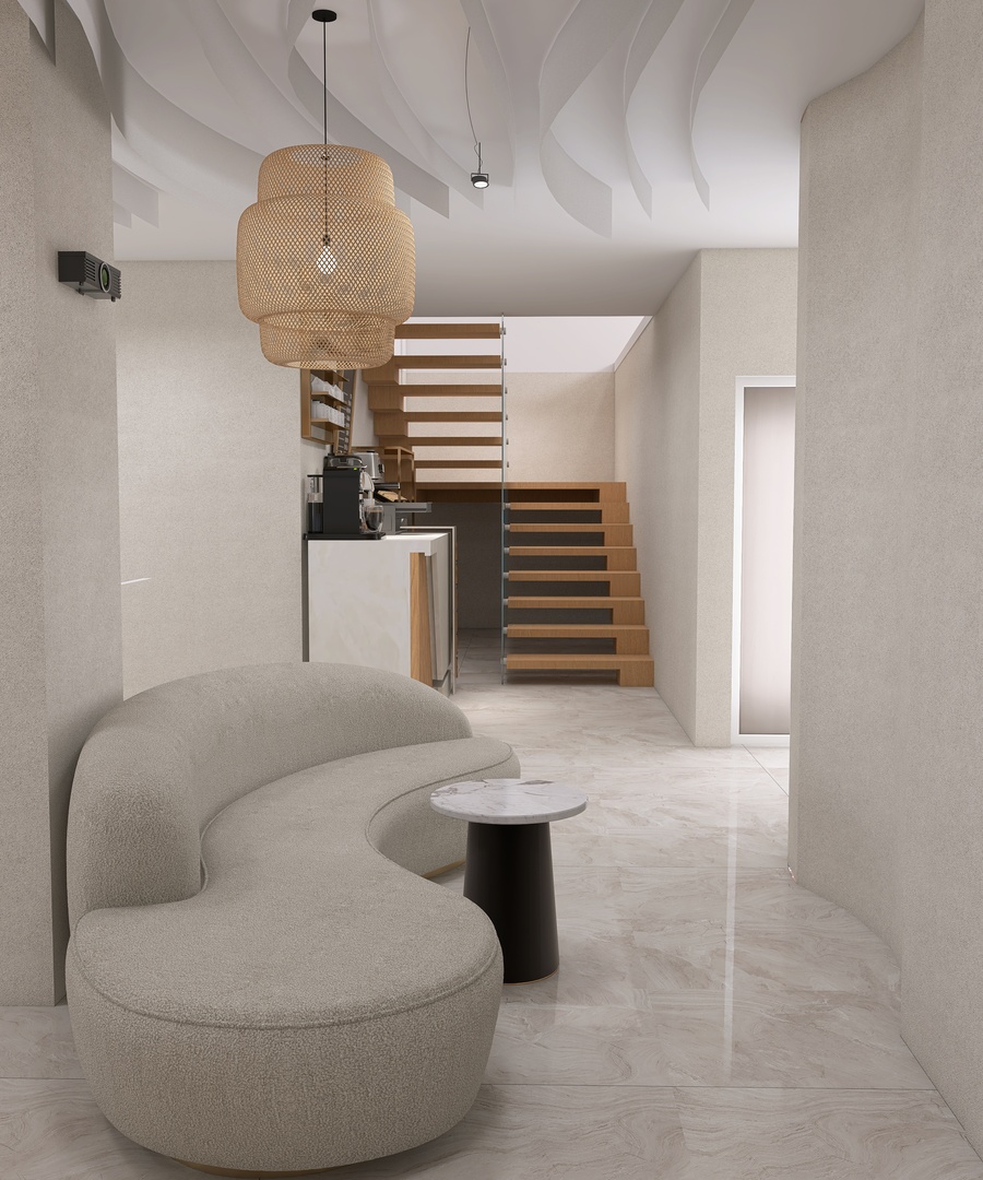 Плавные линии и округлые формы в мебели и потолочных конструкциях. Это тонкий салон, футуристический и мягкий характер. Из концептуальных решений: изогнутая стена для светового луча проектора с зоной отдыха, а также на фоне кофе станция и акцентная лестница.