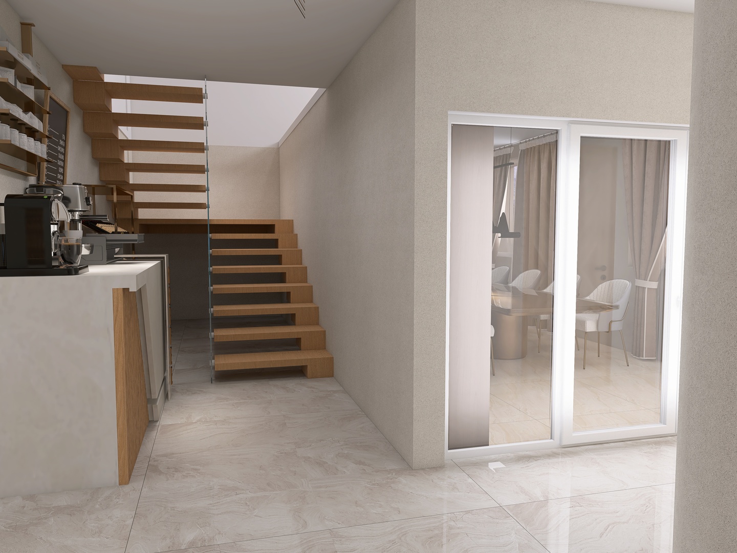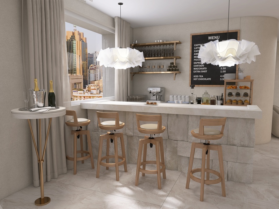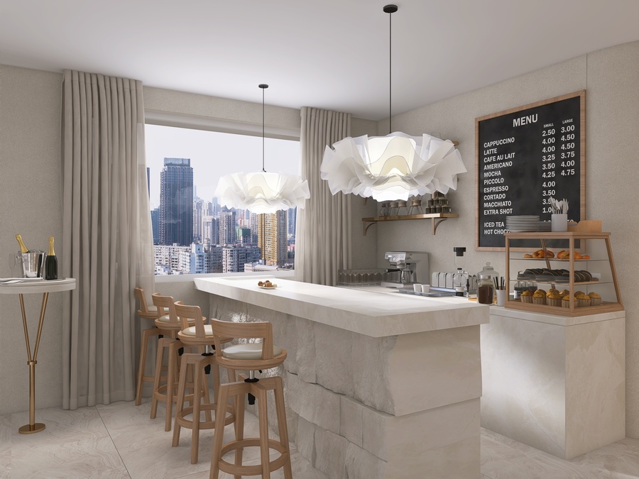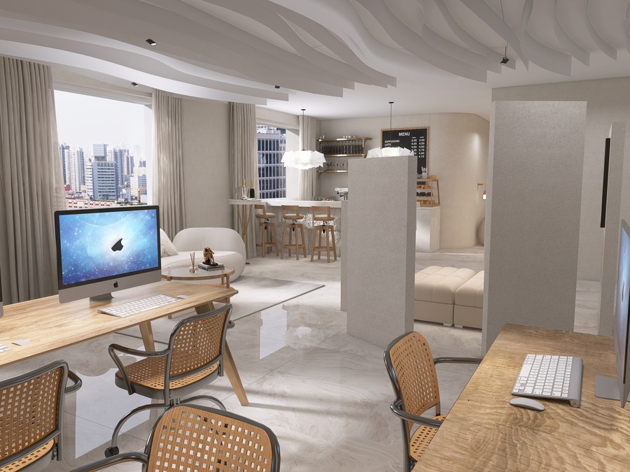 Плавные линии и округлые формы в мебели и потолочных конструкциях. Это тонкий салон, футуристический и мягкий характер. Из концептуальных решений: изогнутая стена для светового луча проектора с зоной отдыха, а также на фоне кофе станция и акцентная лестница.