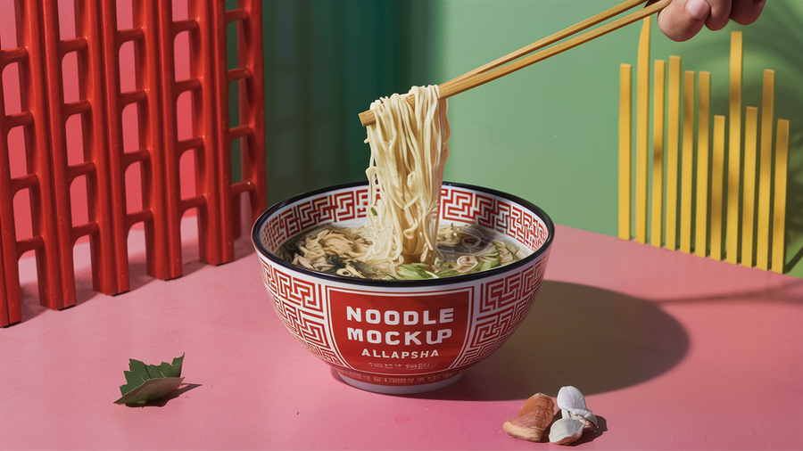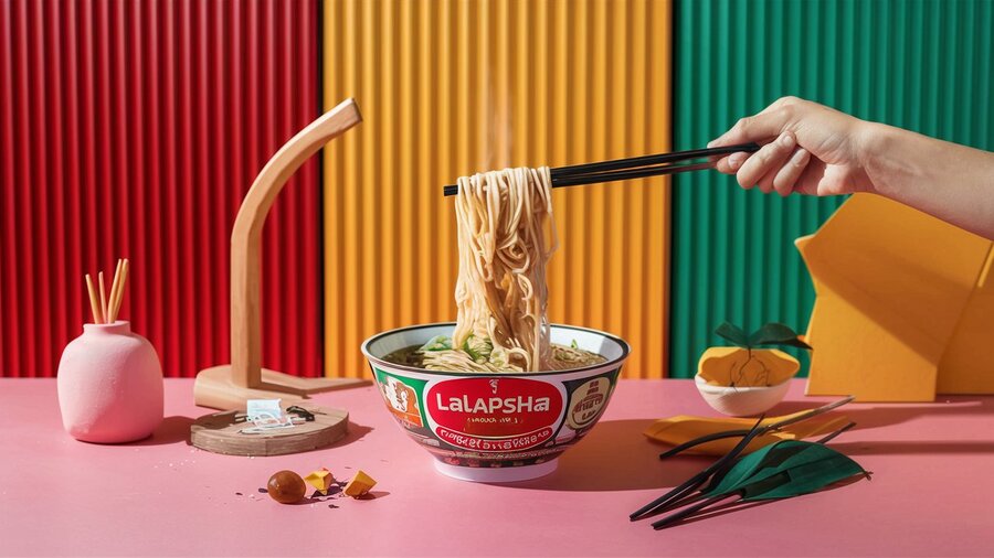 ads merch mockup with style colorful for noodle brand LALApsha, realistic photo 4k style noodle yummy, modern asian aesthetic, red orange yellow green colors --v 6.0