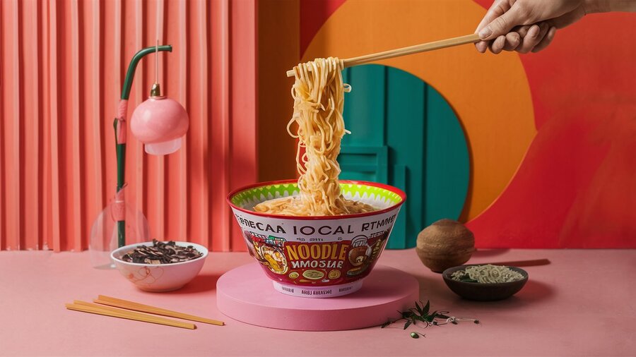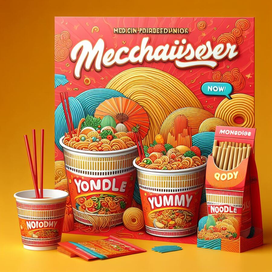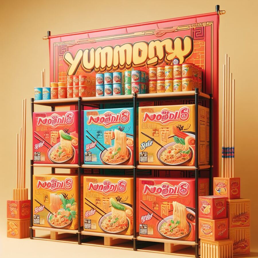 merchandiser production mockup with style colorful for noodle brand, 3d style noodle yummy, asian aesthetic, red orange yellow green colors --v 6.0