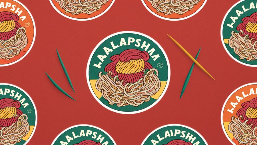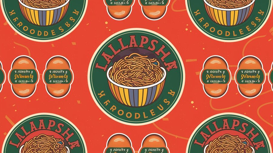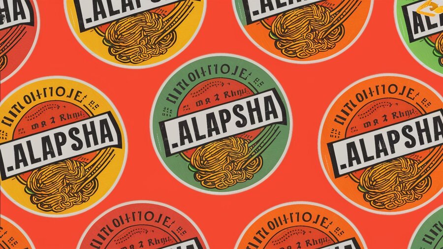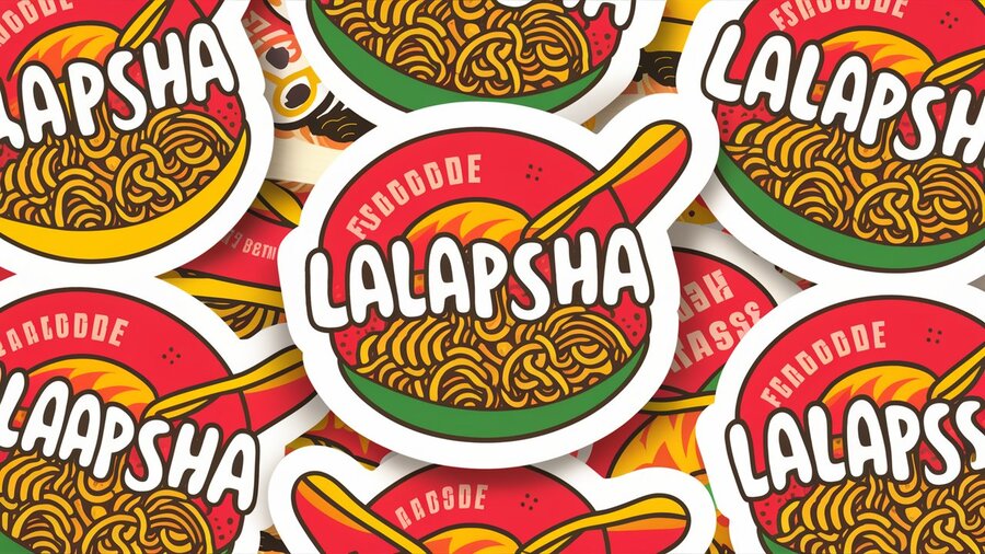 stickers production mockup with style colorful for noodle brand LALApsha, style noodle yummy, asian aesthetic, red orange yellow green colors --v 6.0