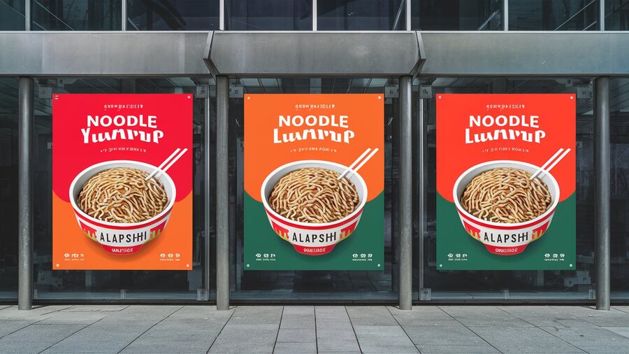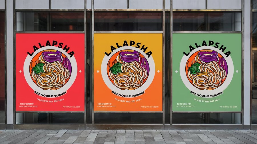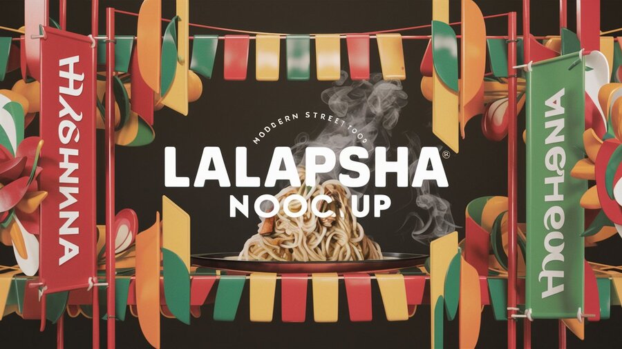 banners mockup with style colorful for noodle brand LALApsha, style noodle yummy, modern asian aesthetic, red orange yellow green colors --v 6.0 Ideogram