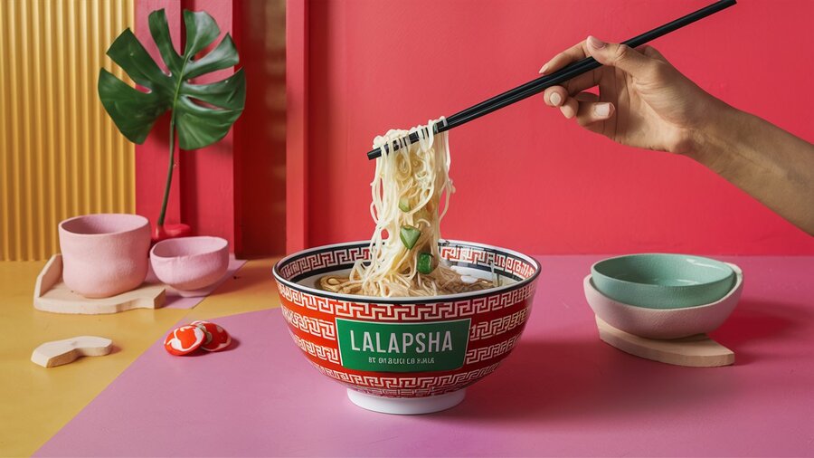 bowl merch mockup with style colorful for noodle brand LALApsha, realistic photo 4k style noodle yummy, modern asian aesthetic, red orange yellow green colors --v 6.0