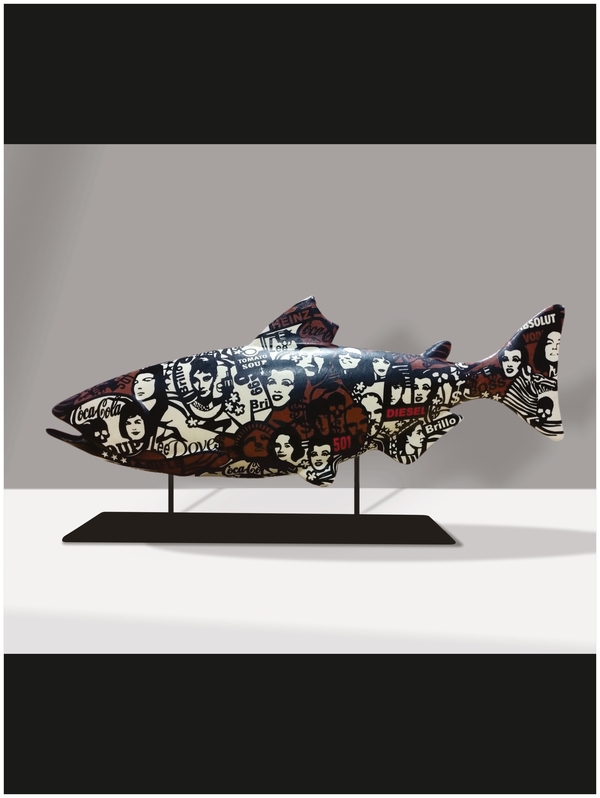 В основе творческого замысла лежит идея изучения американского поп-арта, как направления современного декоративного искусства, а также применение стиля поп-арт в декорировании керамической поверхности живописным и скульптурным способами. Особый интерес вызывает возможность автора продемонстрировать зрителю сплошной облачный декор коллажного типа, наполненный знакомыми образами этикеточного американского поп-арта. Сплошной декор представляет собой соединённый в единое поле контрастный принт состоящий из узнаваемых лиц, брендов известных торговых марок и компаний. В качестве источника изображений были использованы материалы американского художника-оформителя Андрея Вархолы (Andrew Warhola, США). Выбранный для декоративный работы образ рыбы представляет интерес в историографическом контексте, как письмо или информационное послание, отправленное адресату. Ещё недавно (16-18 вв.) на поверхность плоской сушёной рыбы, получившей название — дорожная икона, наносили изображения сакральных образов или послания. В этой связи, сплошной принт типографских массовых печатных изображений американского поп-арта отчасти до сих пор воспринимается как рекламный призыв или послание потребителю массовой культуры.