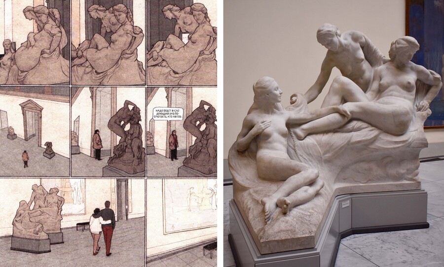 Завораживает то, как с помощью разбивки можно добиться ощущения того, что скульптуры объёмные. Будто бы читатель в ногу с Юбером идёт мимо скульптуры, разглядывая её.