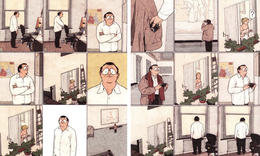 Использование Беном Хейсемансом повторяющиеся по форме и количеству фреймов показывают время, которое герой проводит, созерцая работы. На страницах много статики, подчеркивая вовлеченность героя. Медитативность и тишину нарушают редкие короткие диалоги других посетителей. Использование повторяющихся панелей также раскрывают монотонность жизни Юбера, время, которое он тратит на установку фотографии, подготовку рабочего пространства, проверку работы со стороны, трапезу и просмотр фильмов.