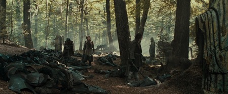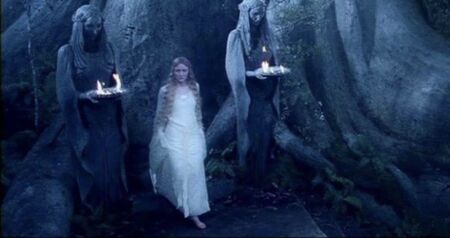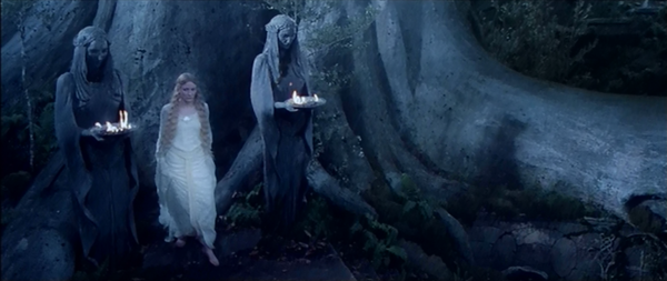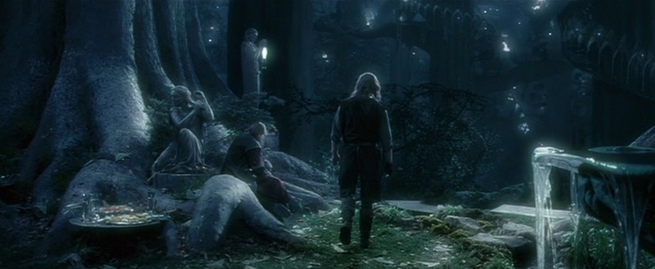 Подобный эффект взаимодействия происходит и в момент, когда Арагорн приходит к могиле матери. Лунный свет, эффект листвы на первом плане создают иллюзию, что перед нами не скульптура, а живая девушка с печальным, страдальческим выражением лица, которая сочувствует герою. Здесь также складывается ощущение диалога статуи и человека.