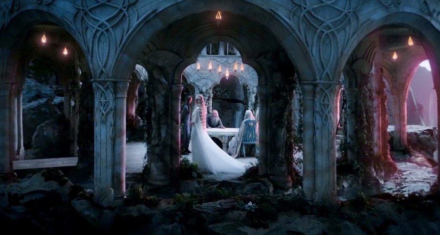 Таким образом, скульптурное оформление серии фильмов «Хоббит» и «Властелин колец» дополняет монументально-декоративный синтез, что особенно выражено в пространстве эльфов. Фигуры негласно задают настроение сцены, будь то спокойствие, равнодушие или сакральность, а также поддерживают визуальное единство.