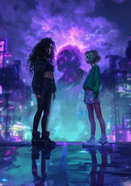 - Concept art for anime style cartoon series. Woman with black long curly hair, blue eyes and stern look, dressed in black leather jacket and white T-shirt. She is standing in the city of the future - Concept art for anime style cartoon series. Girl with short blond hair in green sweater and white shorts standing in city of future - Concept art for anime style cartoon series. An adult thin man with black hair and a stern look stands in purple smoke. His eyes glow
