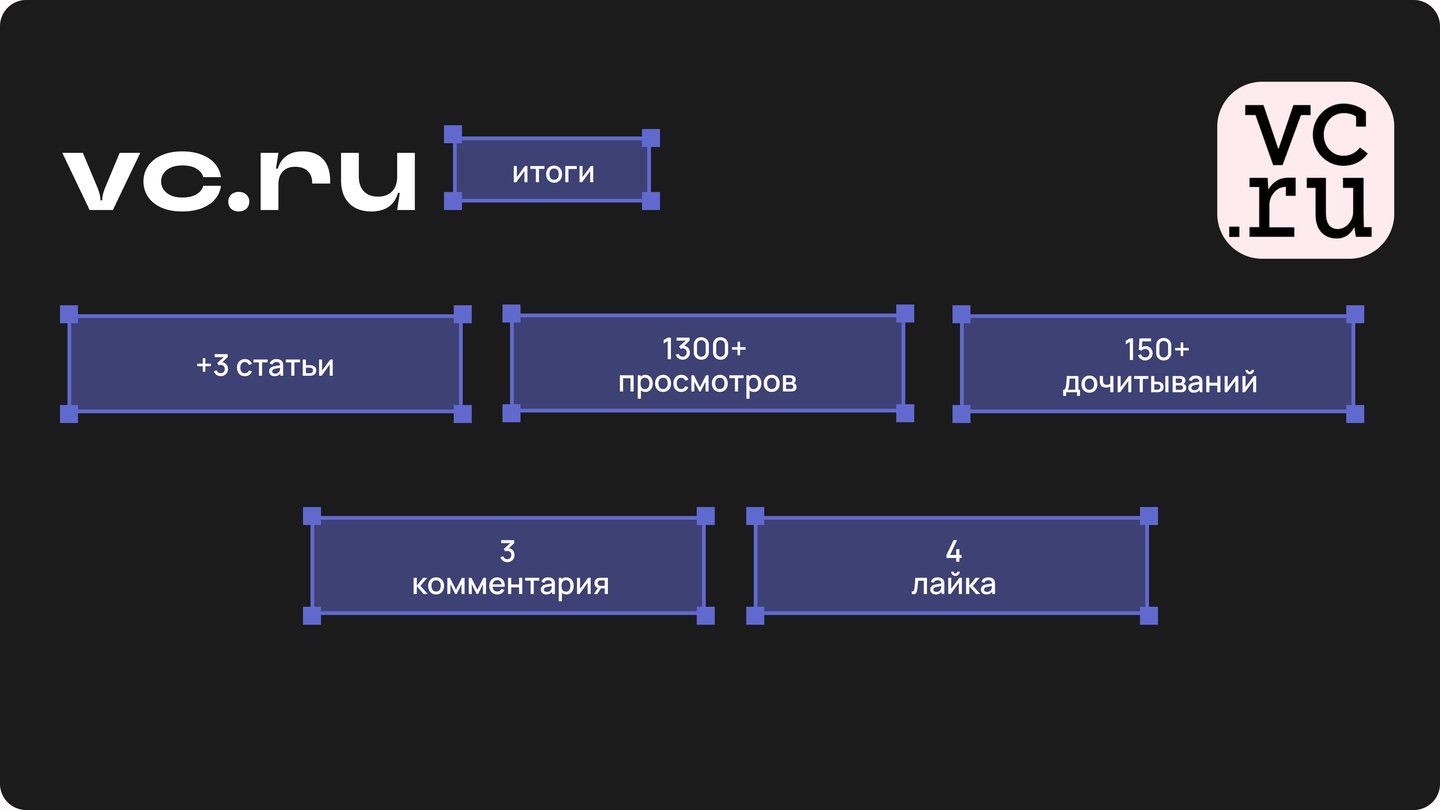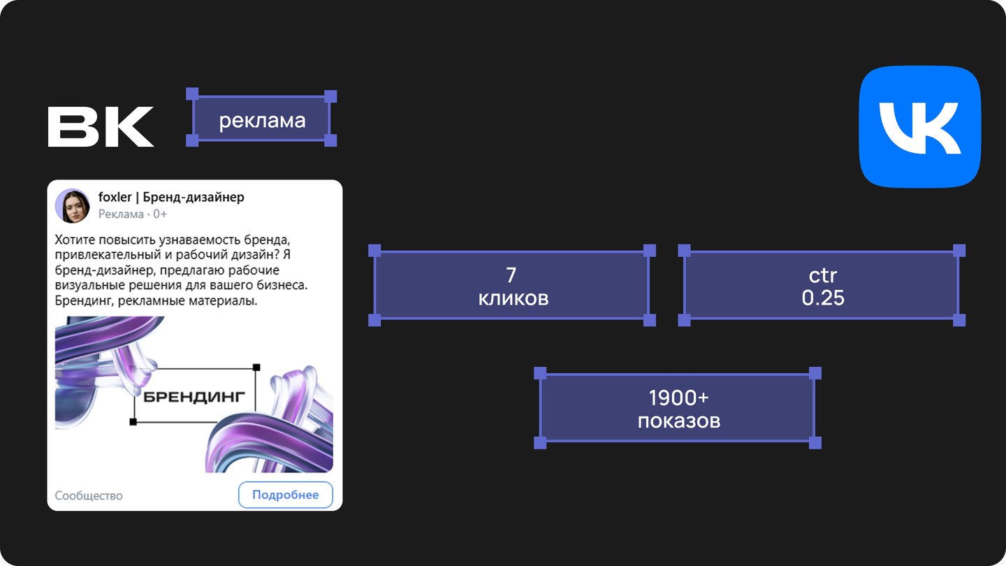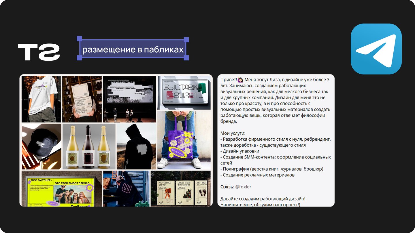 В третьем модуле для меня стояла задача продвинуть свой личный бренд: бренд-дизайнер. В процессе я исследовала различные каналы продвижения: vc.ru, Dprofile, вконтакте, телеграмм, авито. Собрала портфолио, писала статьи и публиковалась на данных платформах. Благодаря использованию различных каналов, мне удалось продвинуть свои услуги, свое портфолио, привлечь новую аудиторию и клиентов.
