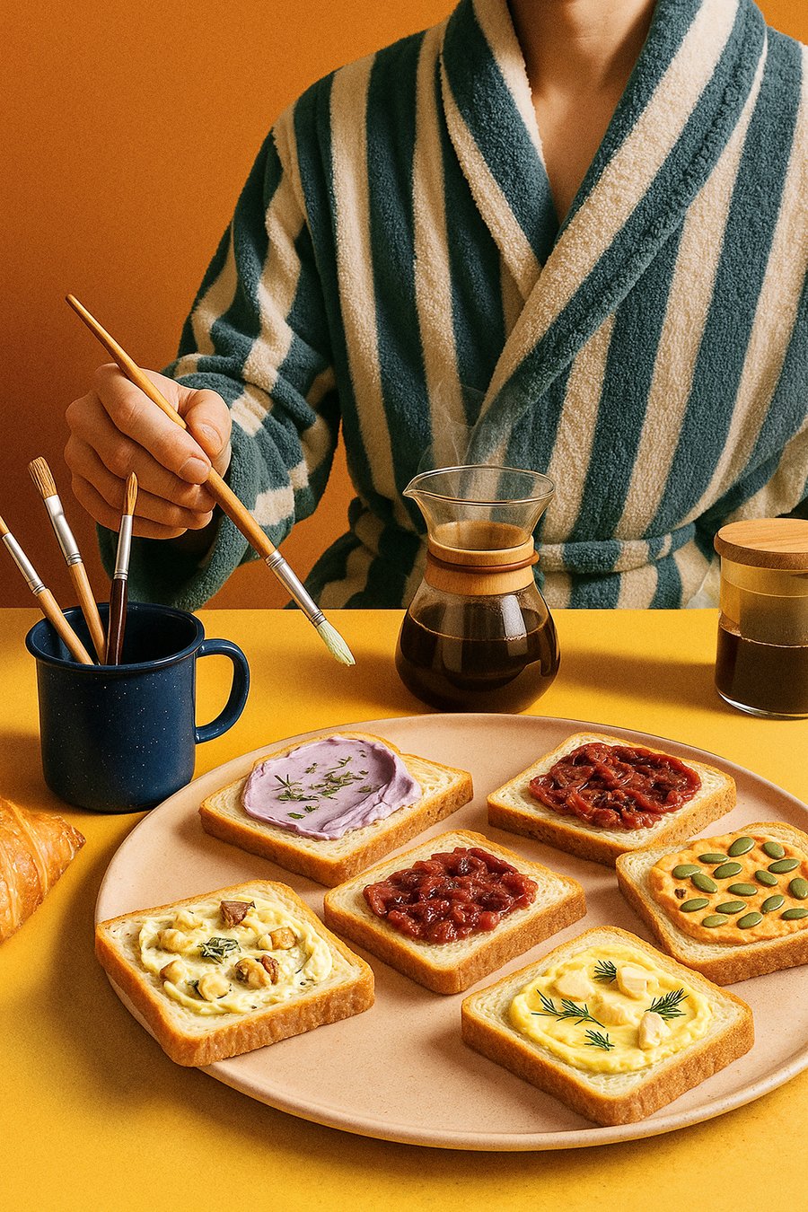 UNBOUND — unconnected, free of traffic restrictions. A sandwich (e.g. «Butter» — butter and «Brot» — bread) is a slice of bread with any food (cheese, sausage, caviar, etc.) used for food as a snack or a light meal. But there was oil in the beginning. BUTTER UNBOUND is a German brand that rethinks conventional oil and enriches it with unusual ingredients. The BUTTER UNBOUND package is a coloured taste palette that invites buyers to create their original, creative breakfast. The illustrations are made by the watercourse (Human-made design, baby!)).