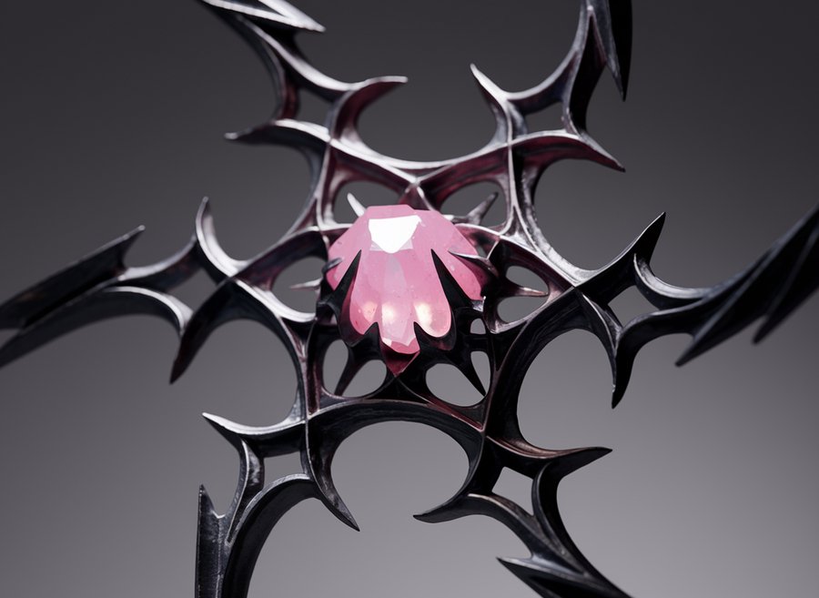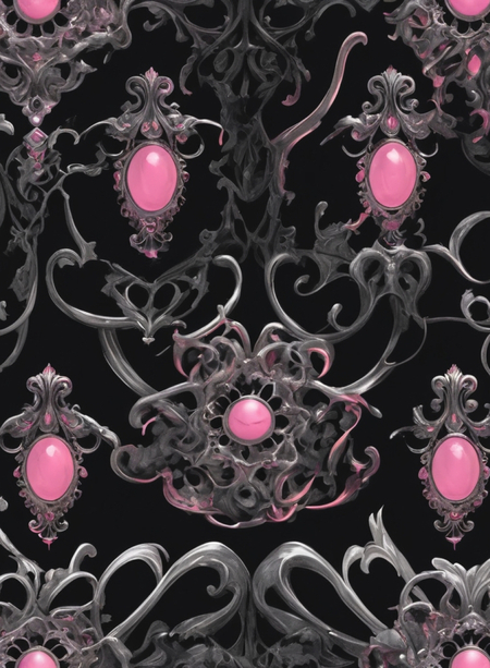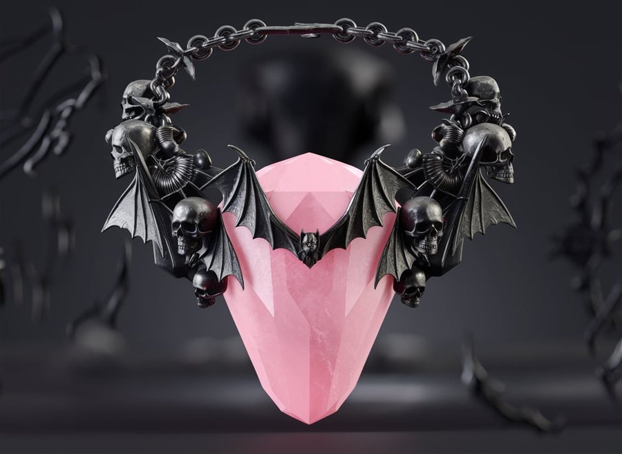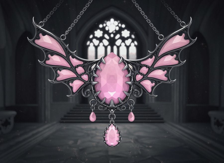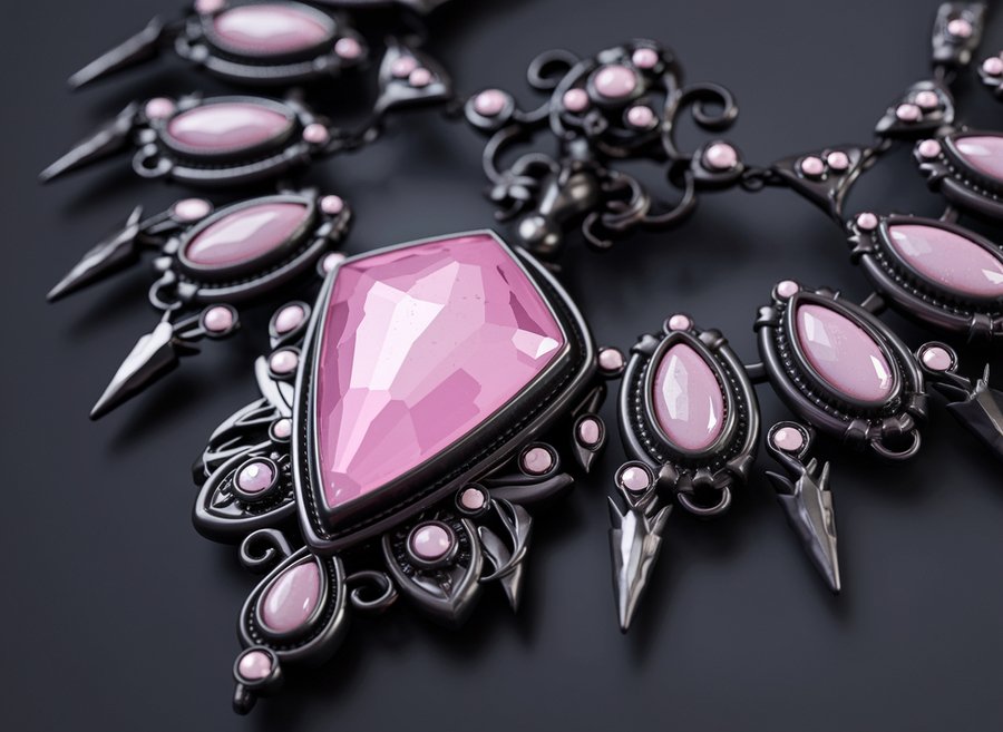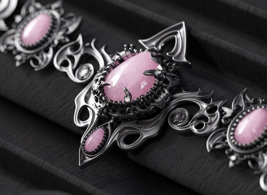 Промпт: Create a magical gothic jewellery in dark metal with a pink stone that has a good effect on the emotional state of people