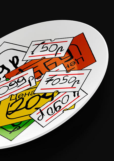 Коллекция фарфоровых предметов «Повышение» отсылает нас к классической проблеме всех магазинов. Я уверен, вы замечали, когда приходили покупать, например, зарядку для телефона, то под обычным ценником может скрываться целая стопка из прошлых ценников, которые налеплены друг на друга. В своей коллекции я бы хотел показать, что такая простая мелочь может быть интересной.