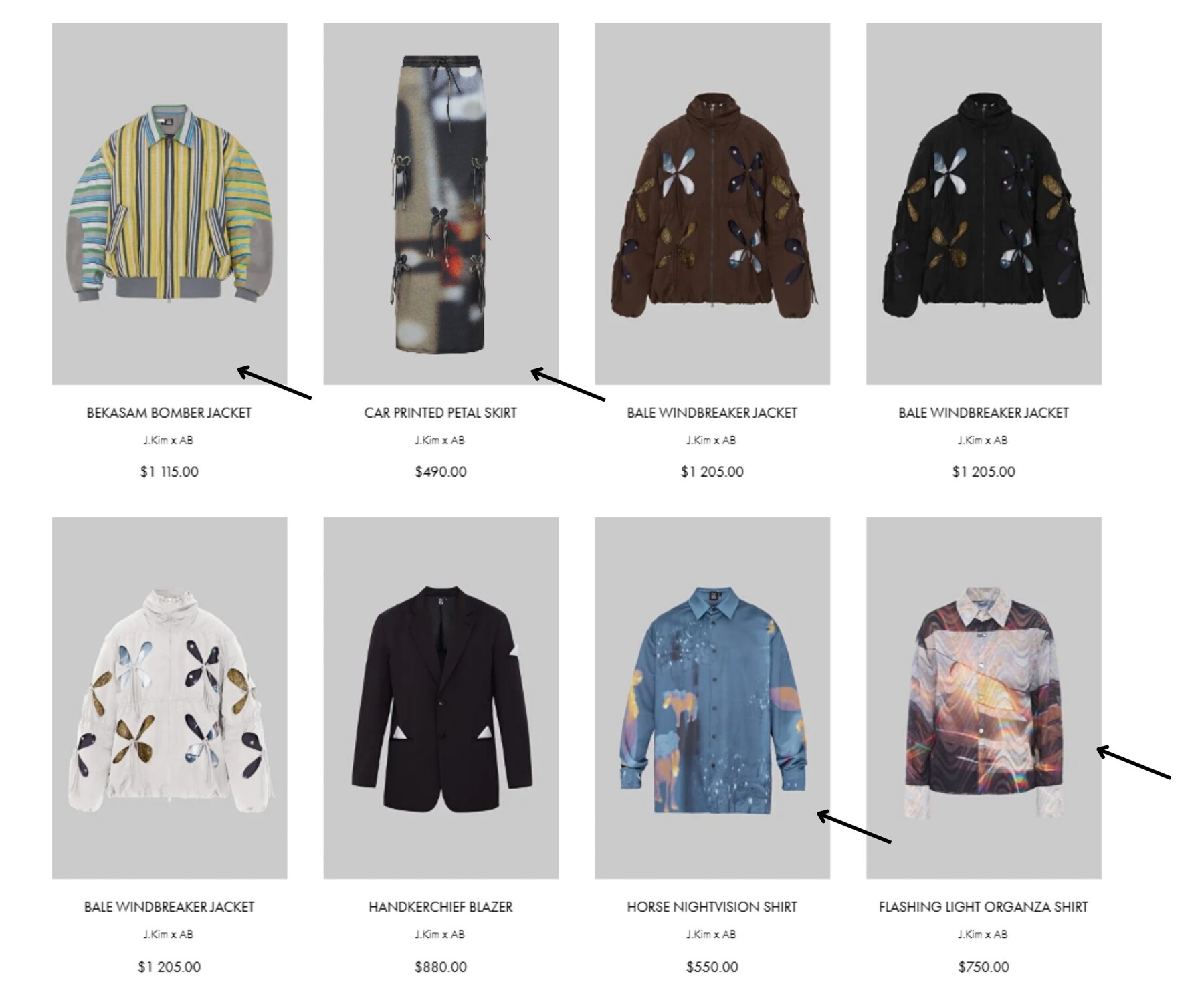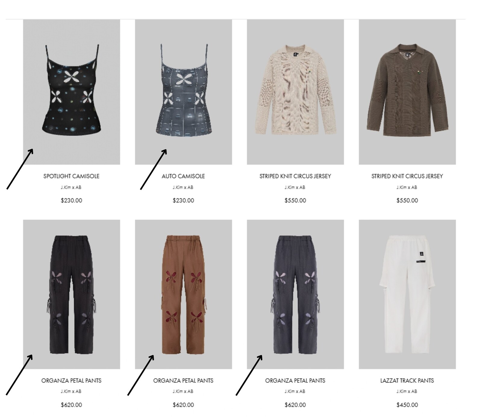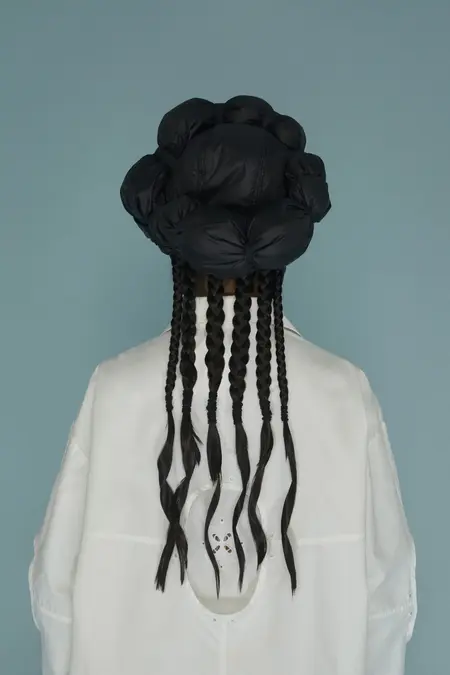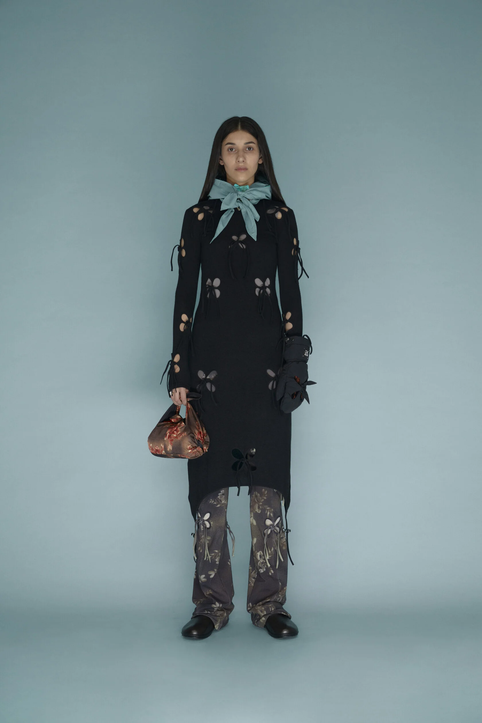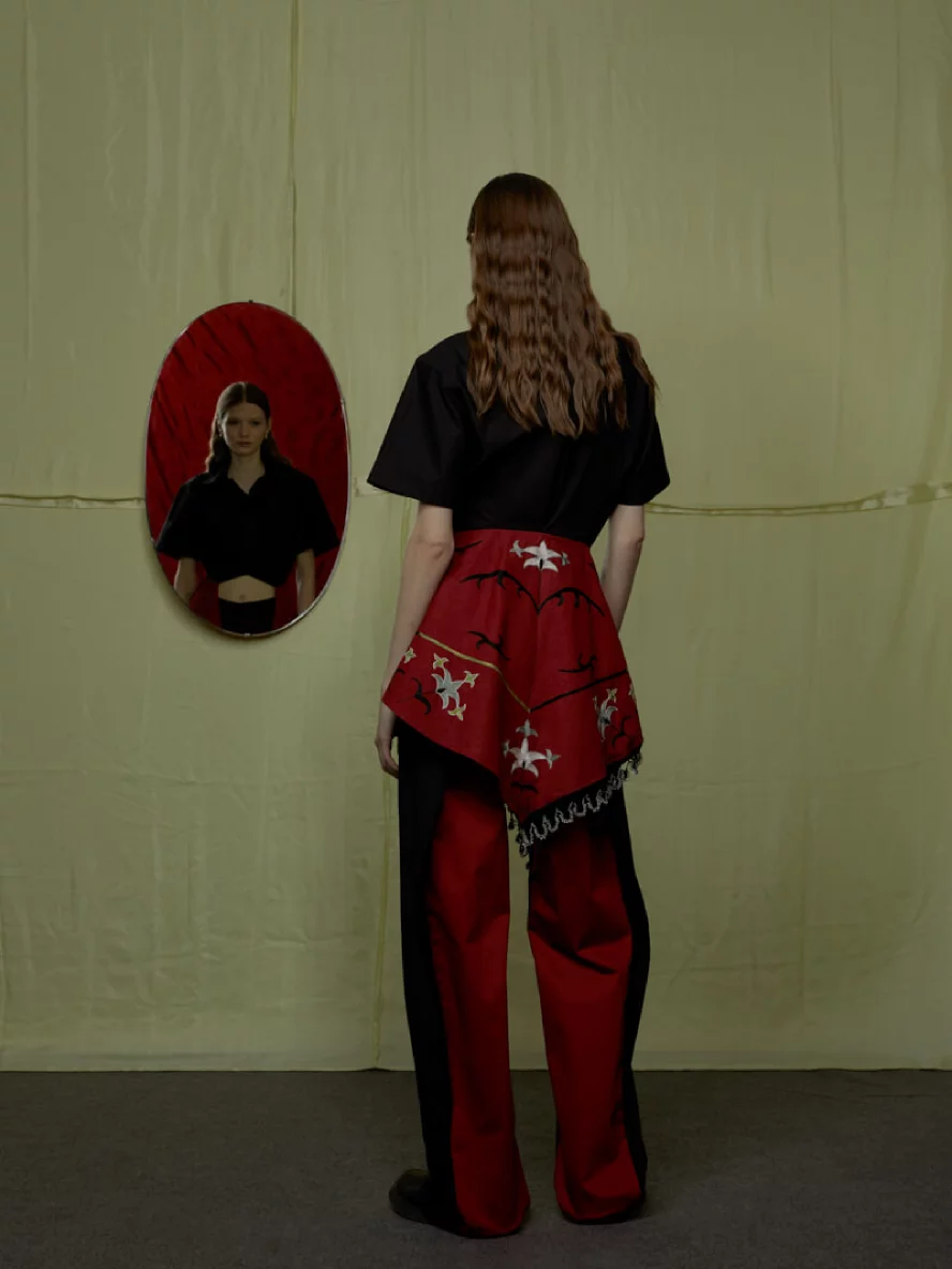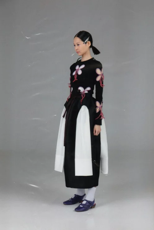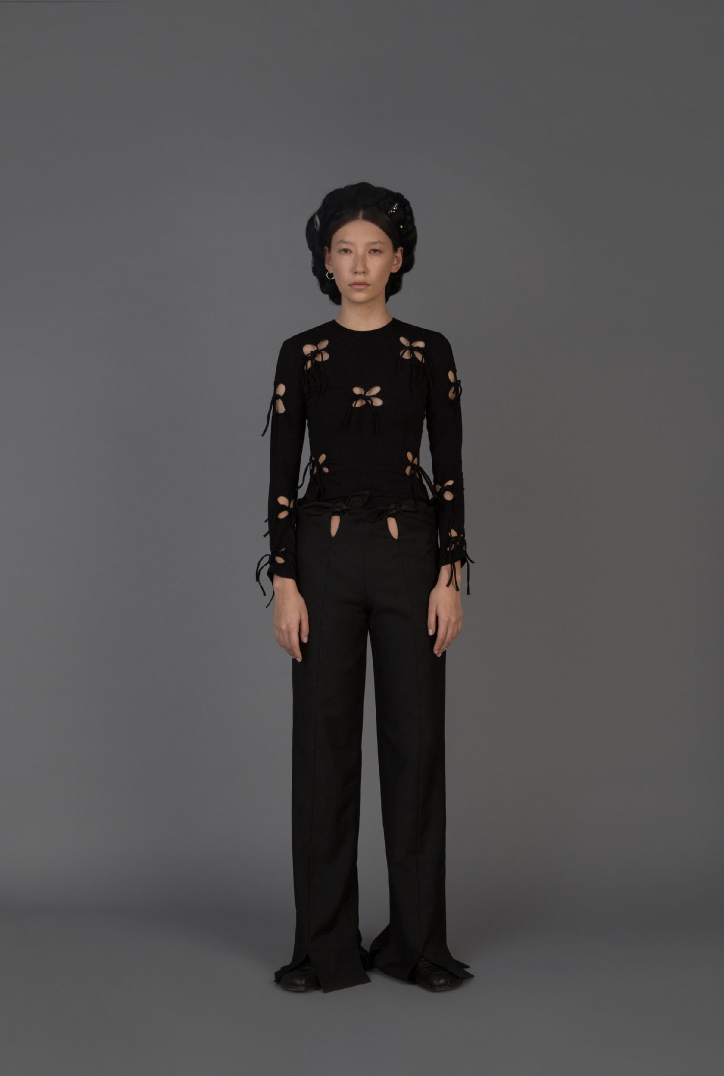 Узор, напоминающий узелки или лепестки. На его создание дизайнерку вдохновили корейские сумки-тюки. Они представляют собой квадратные куски ткани, которые завязываются в центре за углы. «Получается такой четырехлистник», — описывает Ким. По ее словам, этот узор символизирует частые перемещения ее предков: «[Когда я работала над коллекцией] в голове возник образ людей, которые несут на себе большое количество вещей в тюках, и эти тюки наполнены самыми сокровенными вещами», — вспоминает она.