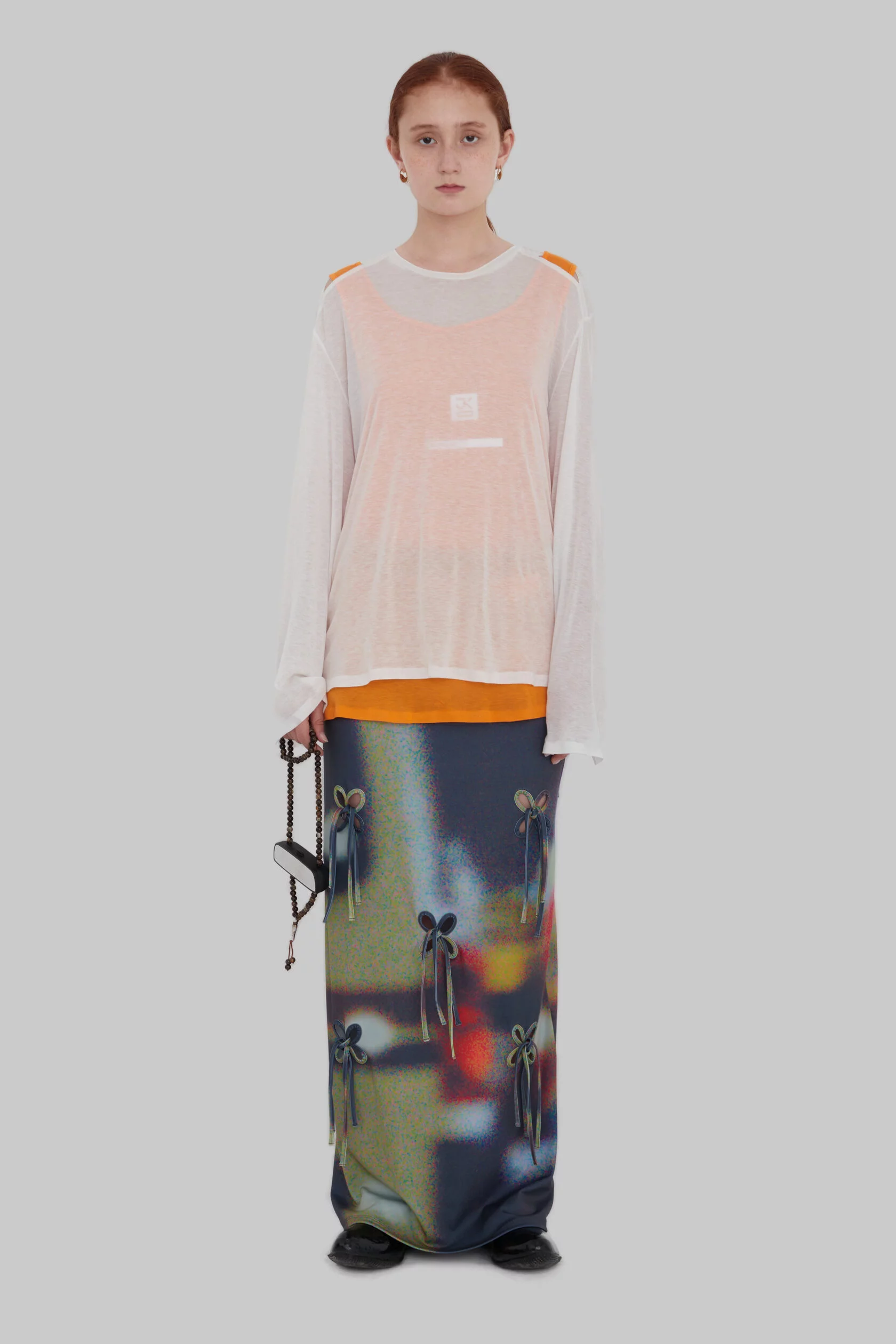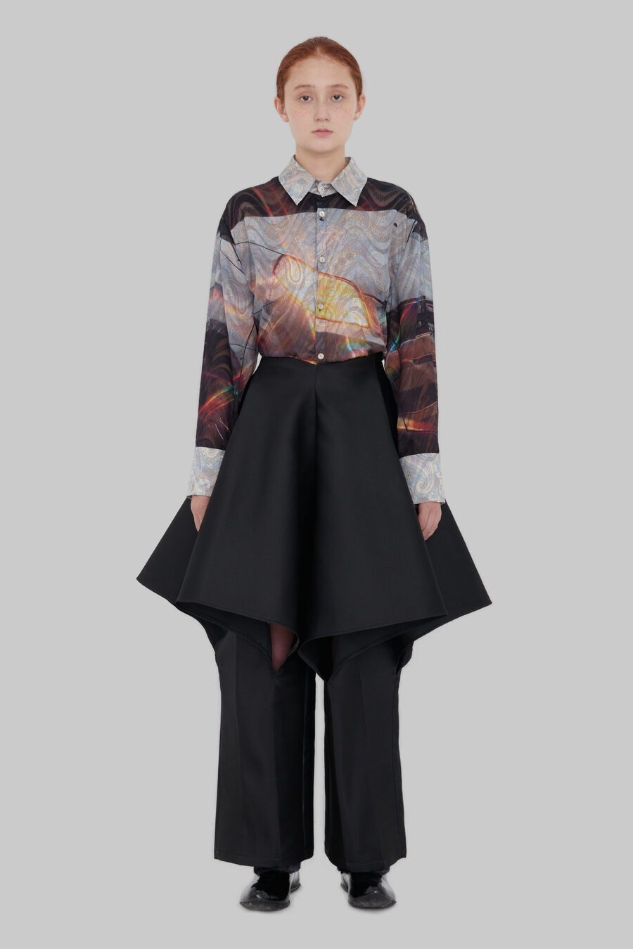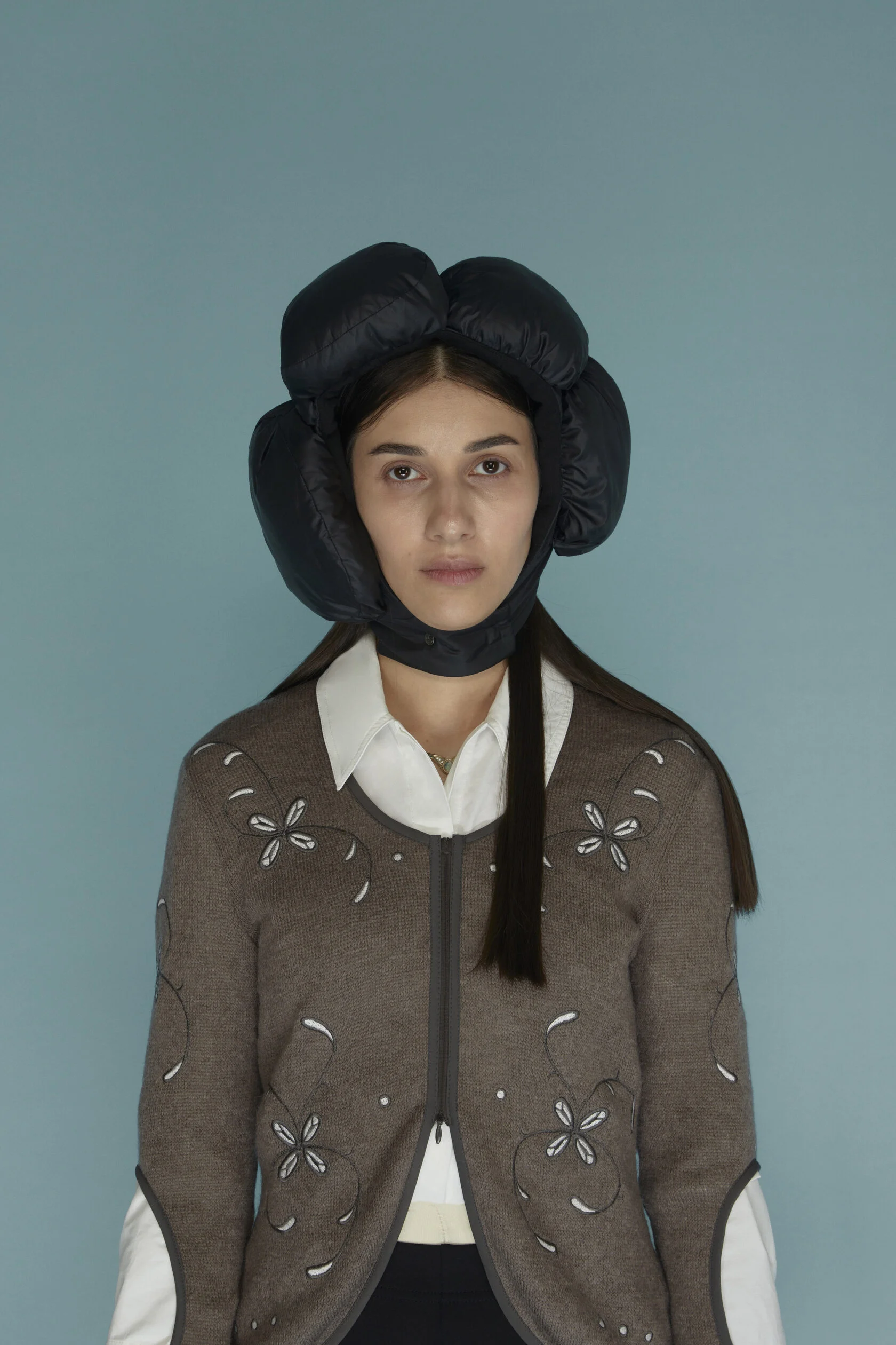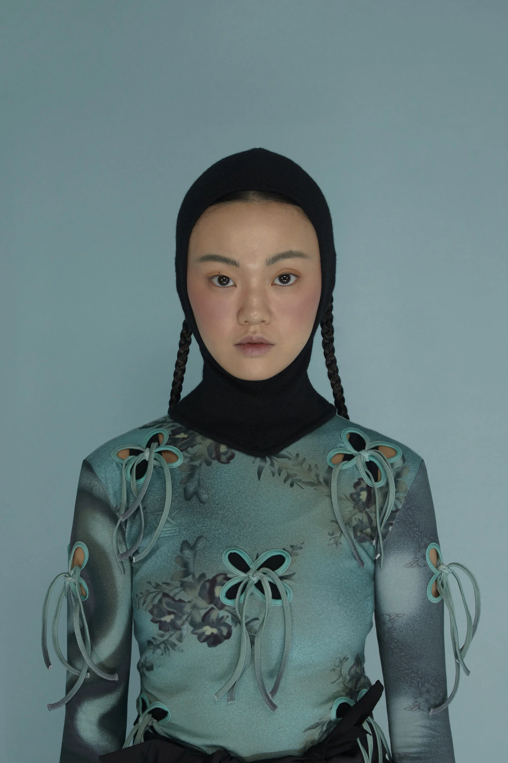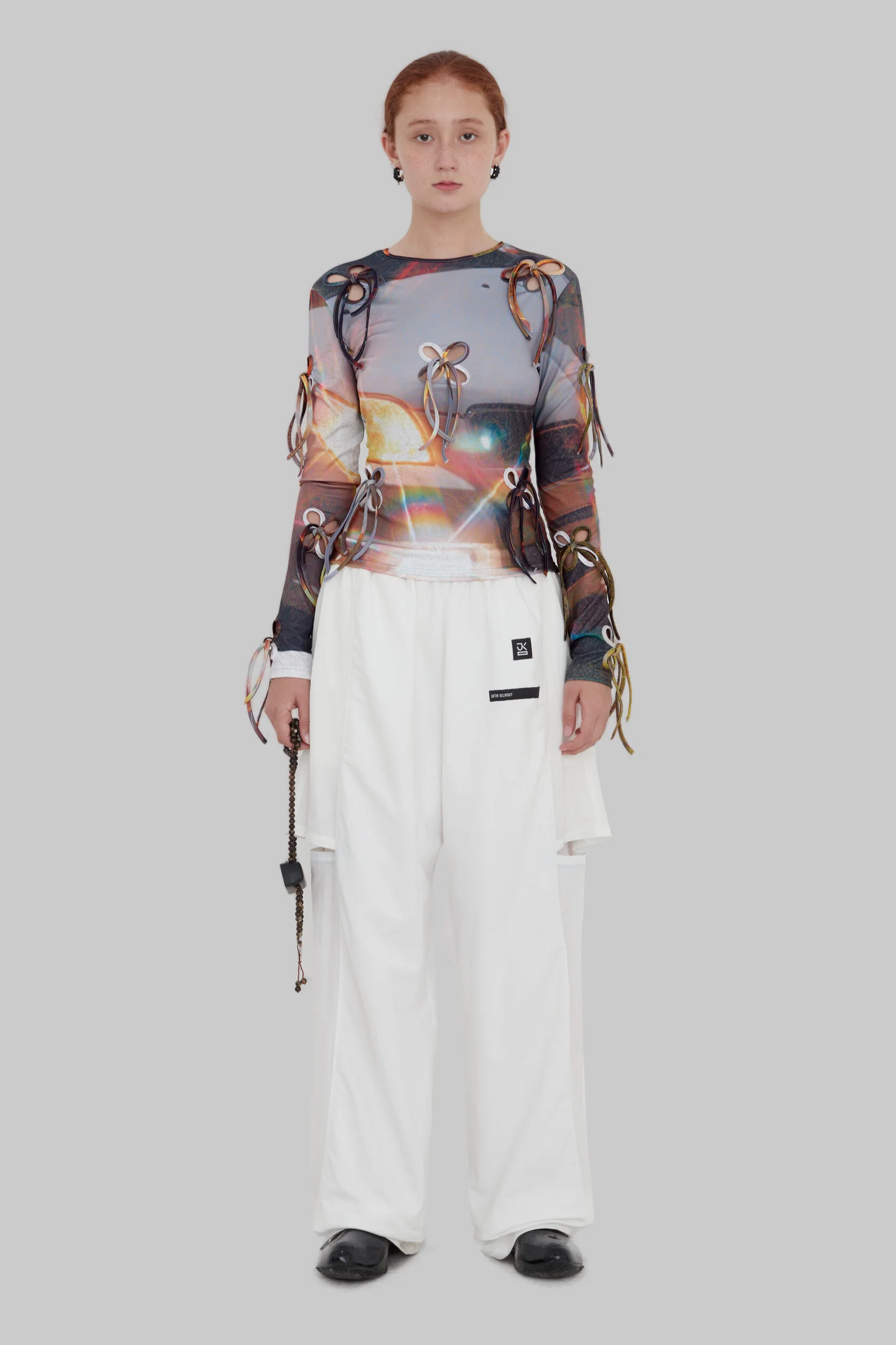 Узор, напоминающий узелки или лепестки. На его создание дизайнерку вдохновили корейские сумки-тюки. Они представляют собой квадратные куски ткани, которые завязываются в центре за углы. «Получается такой четырехлистник», — описывает Ким. По ее словам, этот узор символизирует частые перемещения ее предков: «[Когда я работала над коллекцией] в голове возник образ людей, которые несут на себе большое количество вещей в тюках, и эти тюки наполнены самыми сокровенными вещами», — вспоминает она.
