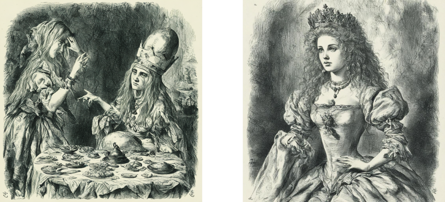 Сначала была создана серия изображений в черно-белом стиле, изображающая объекты и персонажей, подходящих по смыслу произведению и оригинальным иллюстрациям, например, королевы и шахматные фигуры.