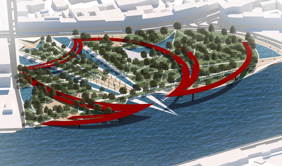 Парк является отражением уникального стиля футуризма, который Балла разрабатывал в своих работах. Основная архитектурная форма парка — это красный мост, напоминающий формы на картинах Баллы. Этот мост служит обзорной платформой, с которой открываются захватывающие виды на город и Неву, но и выступает в качестве центрального элемента паркового пространства, символизирующего движение.