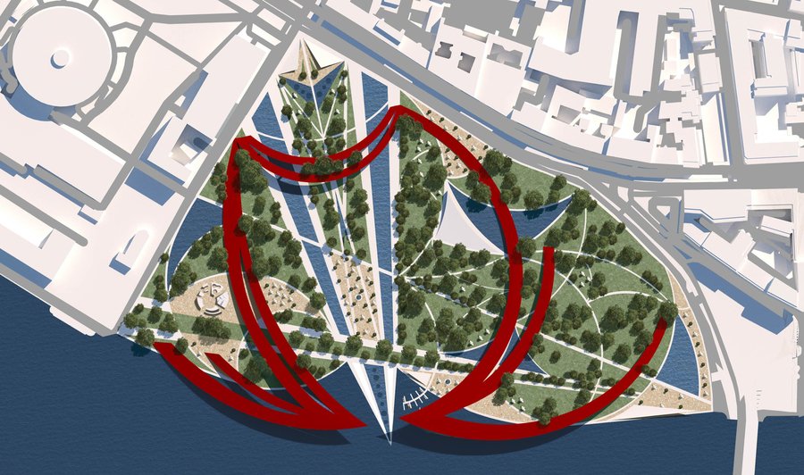 Парк разделен на несколько зон с разнообразными ландшафтными композициями, включающими водные элементы, зеленые насаждения и места отдыха. Проходы и тропинки парка также выполнены в стиле футуризма с использованием изогнутых форм, что создает ощущение движения и потока. Весь парк разработан таким образом, чтобы стимулировать восприятие искусства в динамике и движении, что является ключевым аспектом футуризма. Таким образом, парк является не только местом для отдыха и прогулок, но и платформой для культурного обогащения и восприятия города с новой перспективы. Он предлагает уникальный способ взаимодействия с искусством и природой, подчеркивая красоту и величие Санкт-Петербурга.