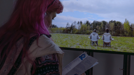 Двухканальная видеоинсталляция-наблюдение за комплексными отношениями между дискретным и непрерывно меняющимся. [1] Герои видеоарта сидят в поле и наблюдают за бегущим небом. По очереди они выбирают облака и стараются описать их друг другу.