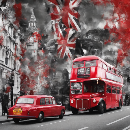 Продолжая свой путь по столицам, я решила еще несколько раз поэкспериментировать в рамках одной локации, в данном случае Лондона, но с разными промтами — с людьми и без. Людей ИИ проработал плохо, а вот автобус на дороге получился восхитительный! Стиль фэнтези очень хорошо внедрился в текстуры неба и перемешался с британским флагом.