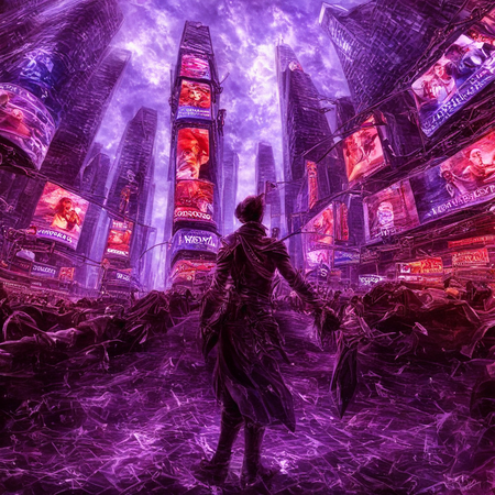 Для начала теста я взяла Нью Йорк, как самый киношный город, который в первую очередь надо перевести в разряд фантазий. Решила попробовать ввести один и тот же запрос два раза, чтобы посмотреть какой разброс вариантов возможен в таком случае. В итоге вид локации почти не меняется, а вот цвет, ракурс и наполнение — совершенно разные. И в первый раз получился более подходящий образ Таймс сквер в стиле фэнтези, нежели во второй.