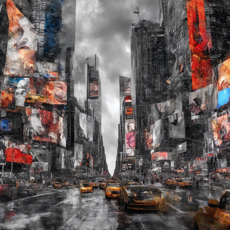 Второе изображение по запросу той же самой локации оказалось более реальным — цветовая гамма сохранилась в своем естественном виде, однако от исходников позаимствовалась некая драматичность и апокалиптичность. ИИ также взял текстуры с референсов и перенес их на Таймс Сквер. Текстуры дождя и форма света также продублировались через мой промпт на изображении.