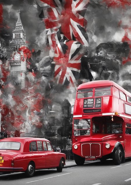 Вторая вариация промта про Лондон, где уже нет никаких людей, является, на мой взгляд, самым идеальным проявлением заявленной концепции. ИИ не просто копировал и вставил отличительные черты фэнтези, а переработал смыслы и доработал их по-отношению к реальности. Мы можем увидеть с одной стороны идеально сложенные автобус и автомобиль, но с другой стороны небо и воздух полностью переработаны в соответсвии с законами мира фэнтези, но при этом несут смысли реальности, такие, как например британский флаг.