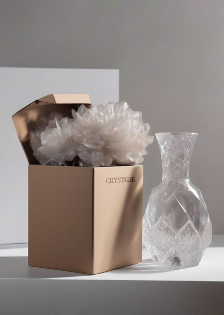 Промт: box mockup in the interior of crystal vases, cold shades, commercial studio photo, scuffs of photographic film, artifacts of photographic film.