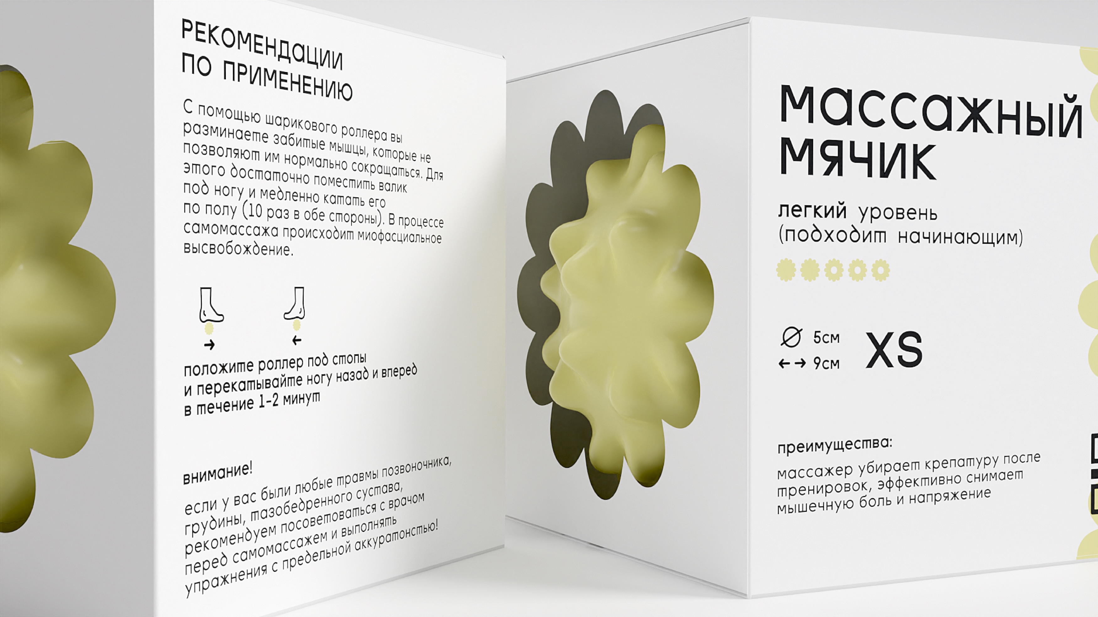 Бренд представляет 3 основных позиции: роллер для спины, шарик для ступ и кистей и скакалка с массажными ручками