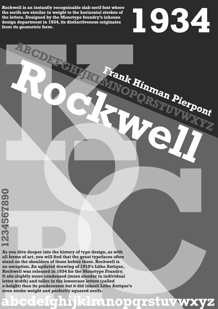 Исторический контекст Шрифт был разработан в 1934 году американским типографом Мэтью Картером и выпущен компанией Monotype. В период своего появления Rockwell стал популярным благодаря своей четкости и выразительности, что сделало его идеальным для заголовков и рекламных материалов. Шрифт отражает дух времени, когда индустриализация и массовое производство начали оказывать влияние на дизайн.