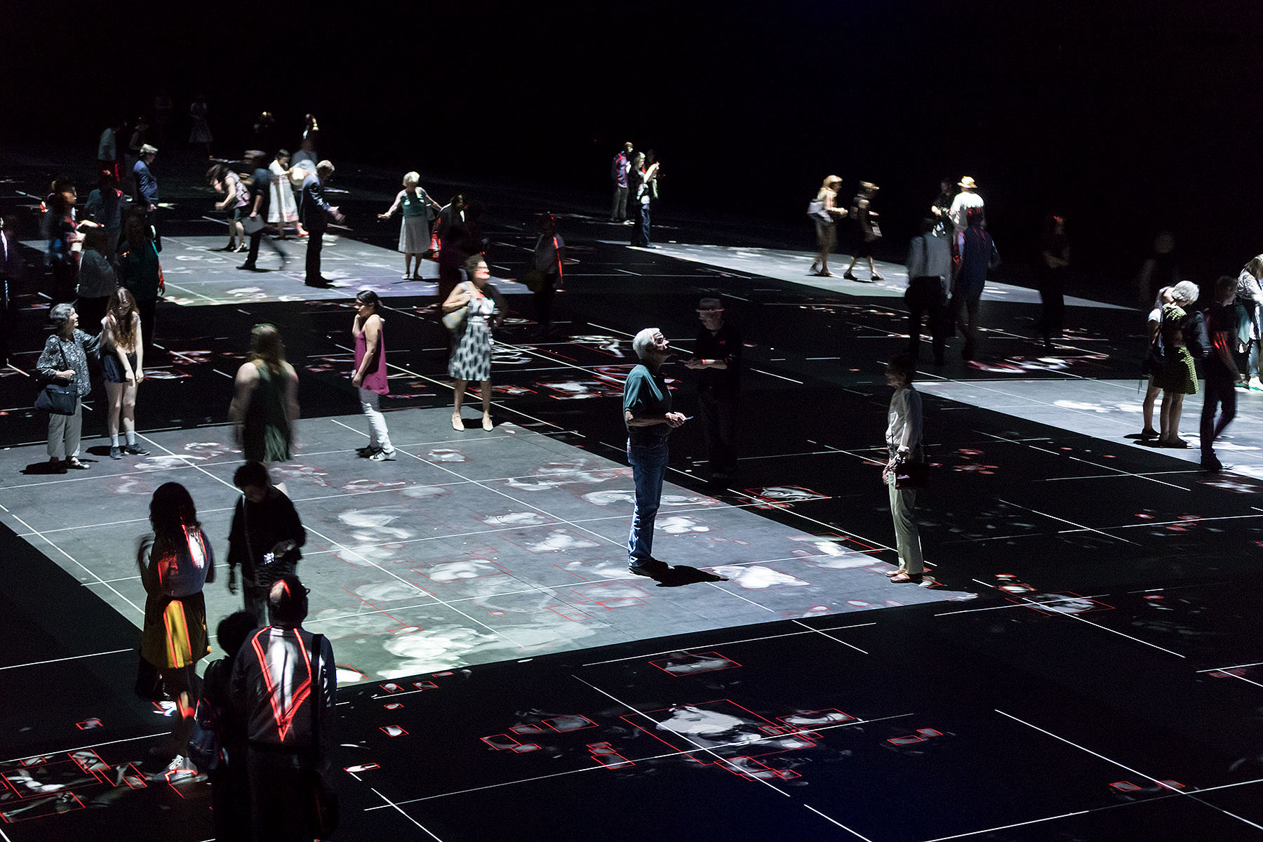 Посетители, попадая в тёмное помещение, становились объектами наблюдения инфракрасных камер и дронов, фиксирующих их движения, которые тут же проецировались на пол-экран.